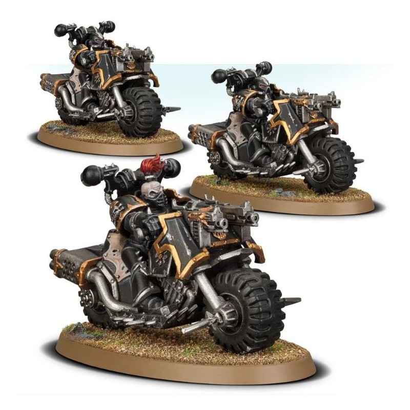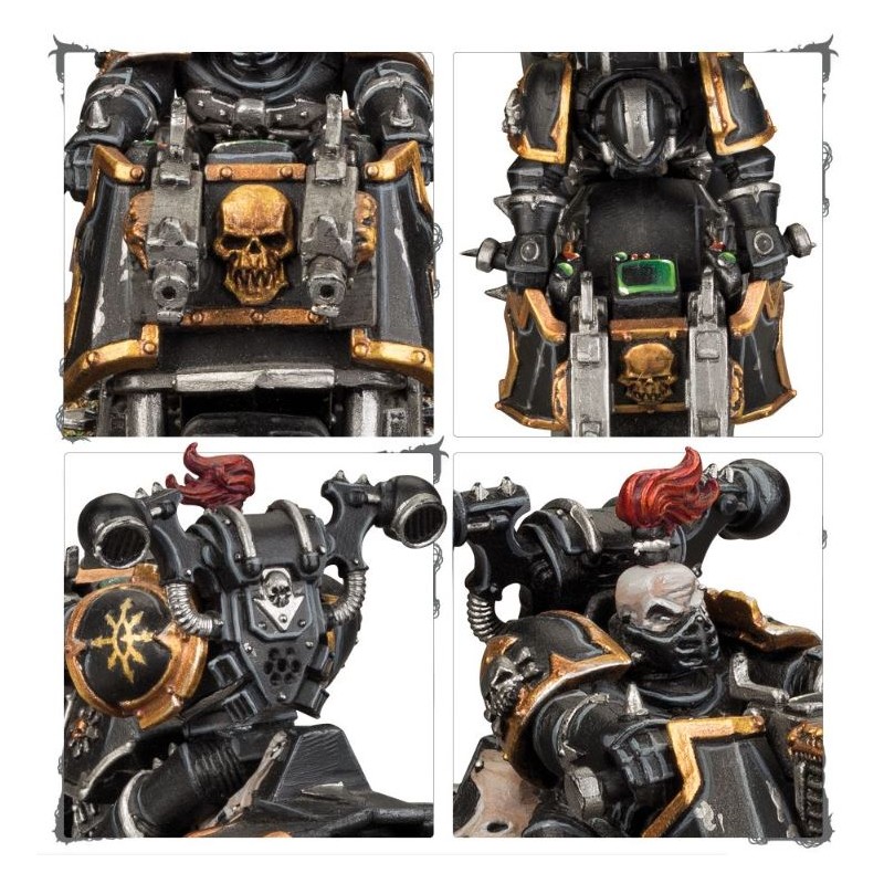Ce kit permet de monter trois Chaos Bikers. Tous peuvent être personnalisés avec un choix de têtes, de bras, de corps et de paquetages dorsaux, de sorte à individualiser chaque Chaos Biker.