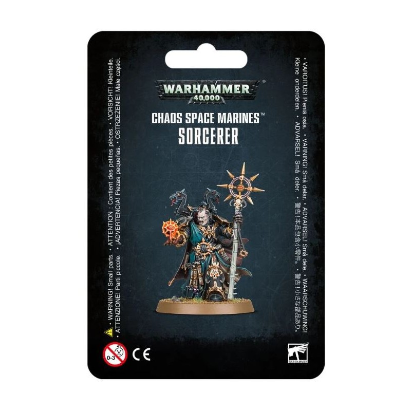 Ce kit plastique en 9 composants permet d'assembler un Chaos Space Marines Sorcerer armé d'un sceptre de force. Fourni avec un socle rond Citadel de 40mm.