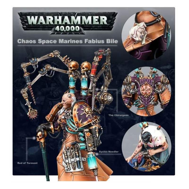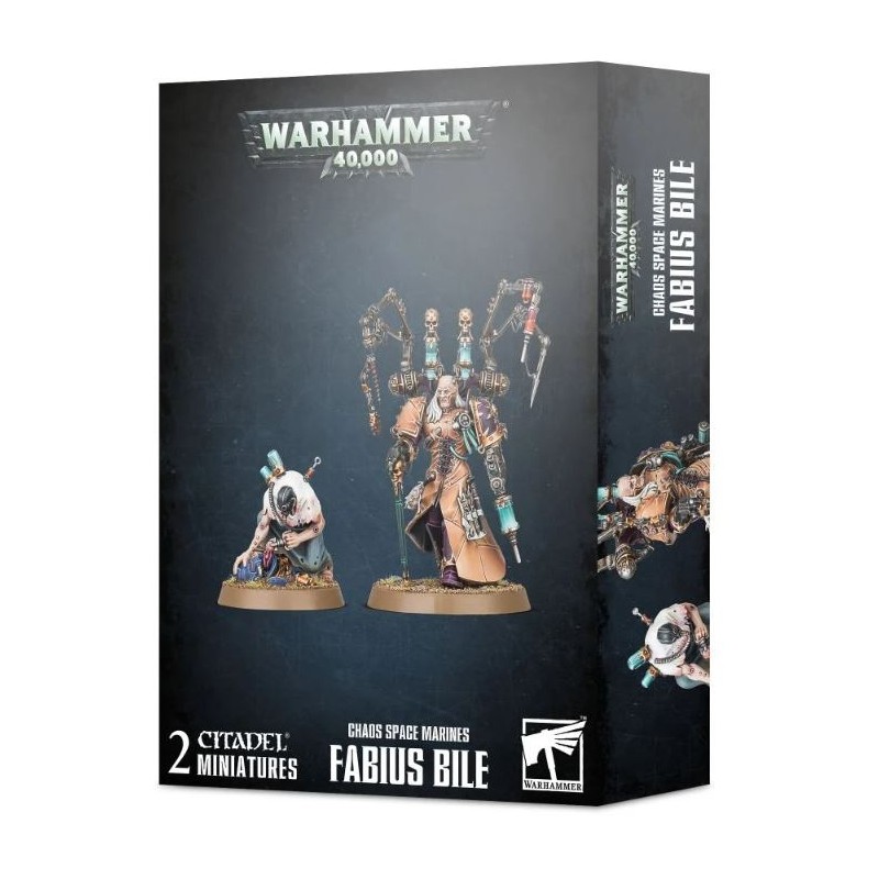 Avec l'assistance de Fabius, vous pourrez lâcher sur la malheureuse galaxie des horreurs génétiquement altérées et soumettre vos ennemis. Bile est par ailleurs largement capable de se défendre, notamment avec son Bâton de Tourment. Il peut s'accompagner d'un Surgeon Acolyte pour l'assister dans sa vile besogne. Ce duo fait un excellent projet de modélisme et de peinture et représente un ajout de choix pour toute armée de Chaos Space Marines.