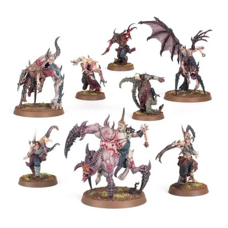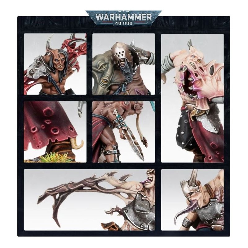 Ce kit plastique permet d'assembler huit Cultistes Maudits : cinq Mutants et trois terrifiants Tourmentés. Ces figurines grotesques regorgent de détails affreux et de mutations uniques, des tentacules grouillants aux griffes tranchantes. Tous les mutants se jettent en avant, des cauchemars de taille humaine portant les restes de robes de cultistes, tandis que les Tourmentés sont d'énormes créatures difformes marquées de scarifications runiques et de sceaux d'union, et dont pendent les vestiges de leur forme humaine.