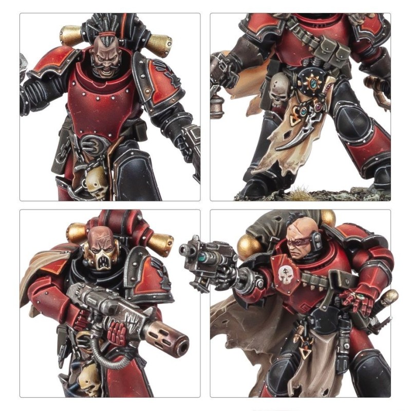 Un des Pillards Red Corsairs peut être assemblé comme champion optionnel, et le kit contient 14 têtes interchangeables, 16 épaulières interchangeables, ainsi que différentes armes, dont des bolters, des pistolets bolters et de cruelles lames de pillard.