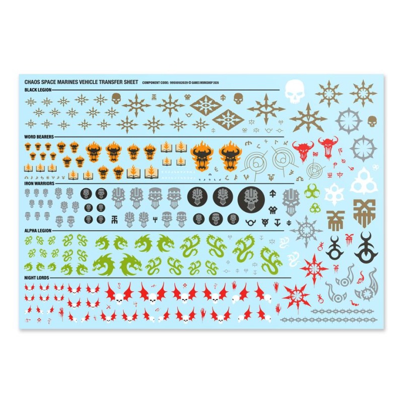 La Planche de Décalcos de Véhicules des Space Marines du Chaos propose 282 décalcos de grande qualité, incluant des symboles de la Black Legion, des Word Bearers, de l'Alpha Legion, des Night Lords et des Iron Warriors, ainsi que d'autres marquages du Chaos pour décorer votre figurine.