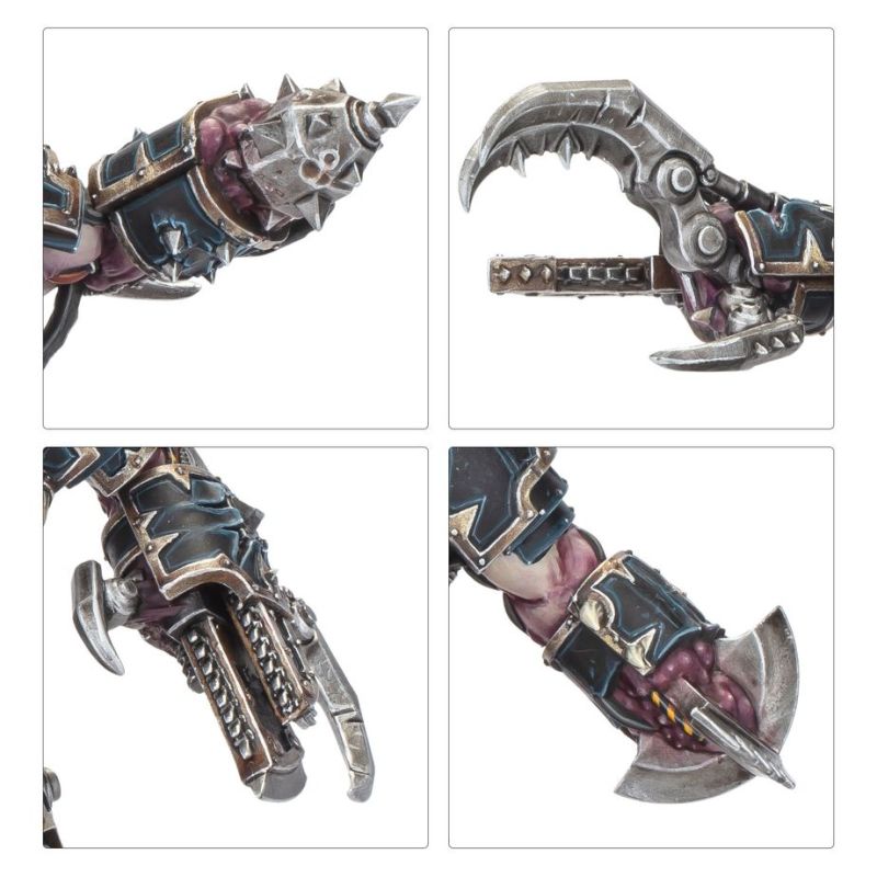 Revêtus d'armures Terminator difformes, leurs corps mutés sont méconnaissables. De la chair immonde et des cornes saillent par les failles qui percent leurs armures autrefois nobles. Leurs membres se terminent en grappes cruelles d'horribles armes métallodermiques, dont de lourdes masses et d'énormes griffes énergétiques. Les armes sont interchangeables entre toutes les figurines, ce qui vous permet de personnaliser facilement vos troupes de choc briseuses de lignes.