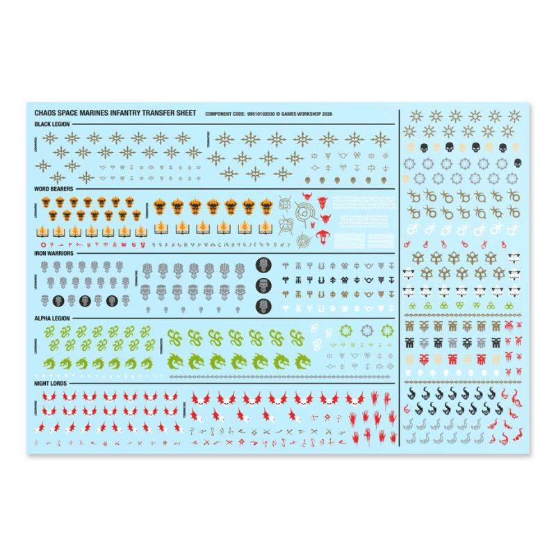 Chaque Planche de Décalcos d'Infanterie des Space Marines du Chaos propose 569 décalcos de grande qualité. Cela inclut des symboles de la Black Legion, des Word Bearers, de l'Alpha Legion, des Night Lords et des Iron Warriors, ainsi que d'autres marquages du Chaos pour décorer vos figurines.