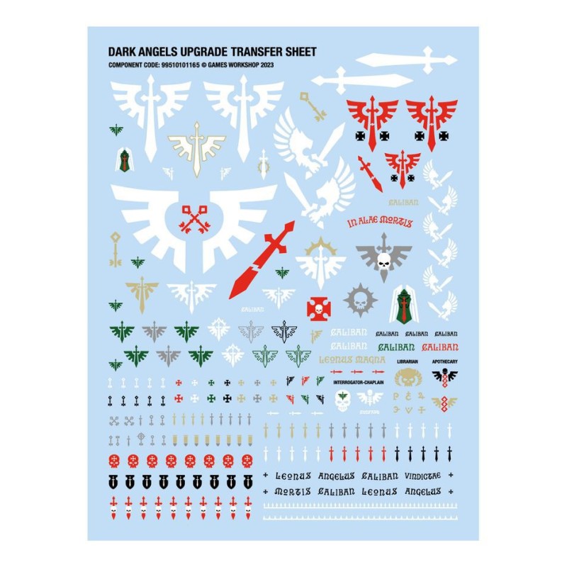 - 1x Planche de Décalcos Dark Angels proposant 217 décalcos pour l'infanterie et les véhicules, comprenant des icônes du Chapitre, des badges de campagne, des écritures gothiques et des symboles de rang.
