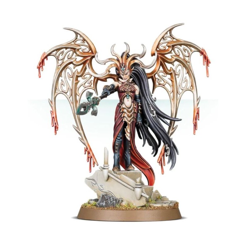 La Shadow Queen est une tout autre histoire – elle est presque trois fois plus haute avec une posture autrement plus agressive, ce qui en fait une splendide pièce centrale pour n'importe quel collectionneur de Daughters of Khaine. Sous cette forme, c'est son furieux aspect serpentin qui prédomine, car tout le bas de son corps est ophidien et enroule ses anneaux autour d'un épais pilier de pierre. Le haut du corps porte la même armure et la même coiffe tout en brandissant Écorche-cœur – mais sa chevelure est ici faite de serpents, et les ailes ont grandi démesurément sous une forme écailleuse, munie de pointes chitineuses promptes à empaler les imprudents. Le socle comporte une victime aelfe pétrifiée et cassée en deux par le regard de Morathi.