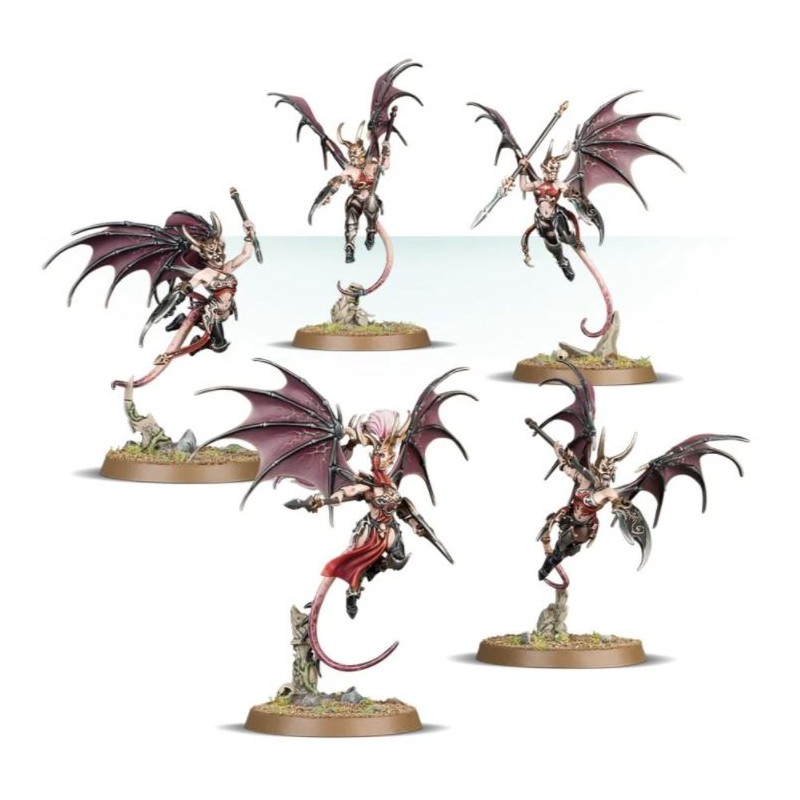 Description du produitLes Khinerai Heartrenders fondent depuis les cieux, telles de sombres flèches traversant les nuages pour s’abattre sur l’ennemi. Des filets de vapeur toujours accrochés à leurs corps, ces aelfs ailées freinent alors brusquement et lancent leurs javelots barbelés. Ces projectiles hérissés de pointes frappent avec une telle force qu’ils peuvent embrocher un cavalier et sa monture avant de se ficher dans le sol, entraînés par leur élan. Si une cible tentante se présente, les Heartrenders oublient les attaques à distance pour l’engager au corps à corps.
