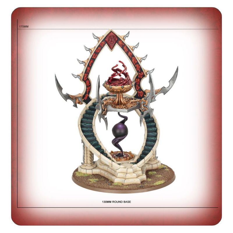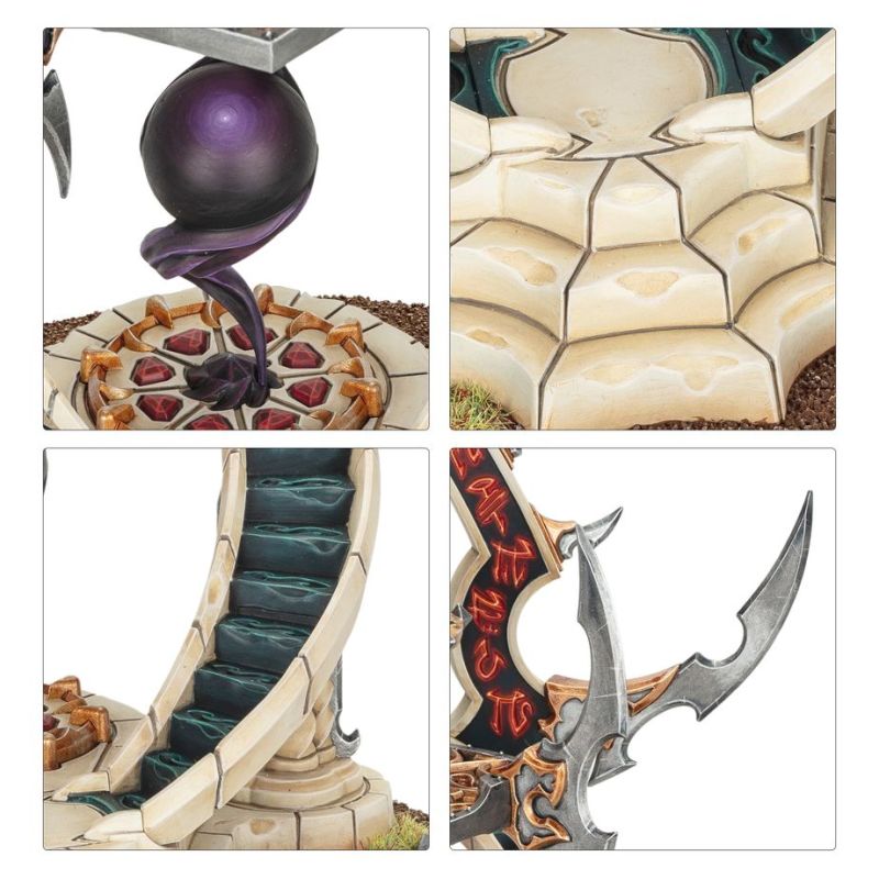Ce kit en plastique permet d'assembler un Autel de Sombre Tribut, un élément de terrain de faction pour vos armées de Filles de Khaine dans les parties de Warhammer Age of Sigmar. Convoquez les sinistres bénédictions de Khaine en pleine bataille, et rendez votre armée encore plus meurtrière. La structure acérée à l'aspect cruel inclut un bassin de sang tourbillonnant au-dessus d'une boule d'énergie mystérieuse, ce qui en fait un projet de peinture plein de caractère et une pièce centrale digne de votre collection. Le kit propose un choix d'icônes, représentant soit Morathi-Khaine, soit Moraï-Heg, pour le sommet de la structure, et le sang tourbillonnant dans le bassin de l'autel peut être remplacé par une volute de fumée.