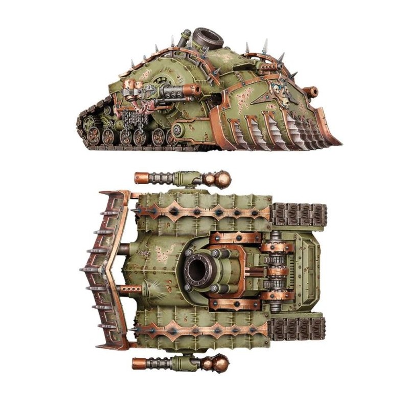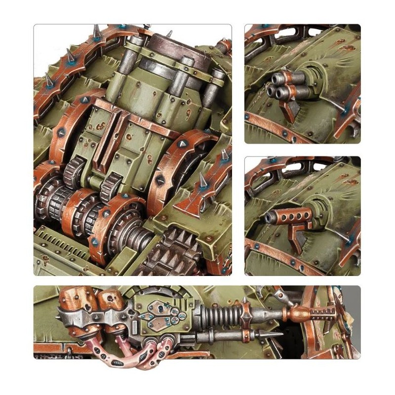Description du produitLe Plagueburst Crawler est un char de siège pesant et redoutable, pourvu d’énormes lames d’éperonnage, d’un épais blindage et de moteurs démoniaques qui lui confèrent une incroyable résilience. Son mortier Plagueburst possède un arc de tir parabolique et une portée terrifiante, tandis que leurs obus associent des explosifs à large rayon et des nuages de spores corrosives pour infliger des dégâts comparables à ceux du canon Demolisher impérial. Le reste de l’armement du Crawler vise justement à massacrer l’ennemi à courte portée, en crachant une vase toxique et des grêles de balles virales.