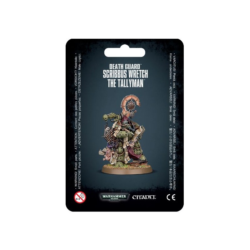 Ce kit plastique contient les composants nécessaires pour assembler Scribbus Wretch, Tallyman de la Death Guard. C'est une figurine singulièrement déplaisante, même pour la Death Guard, qui présente une obsession morbide sur le recensement des malheurs.