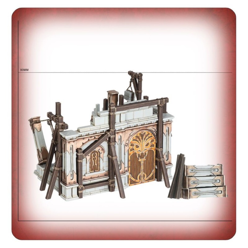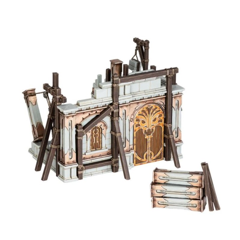 Débordant de détails comme des échaffaudages en bois et du matériel de construction, ces murs et arches sont ornés de la comète à deux queues et autres symboles de l'Ordre. Cette section de mur spécifique est fournie avec un treuil et un empilement de piliers représentant le chantieer en cours.