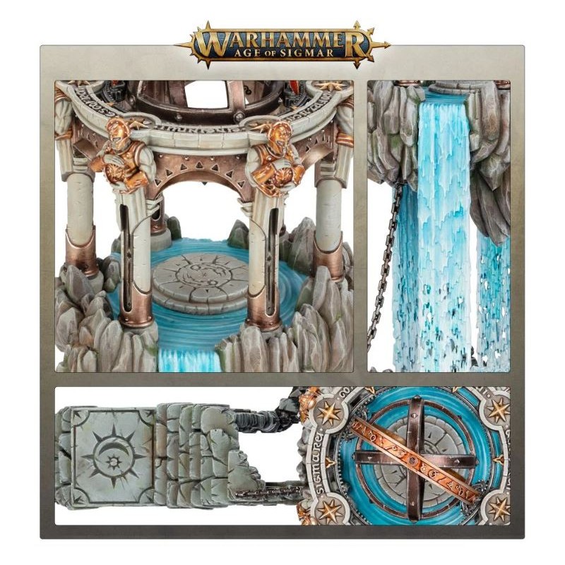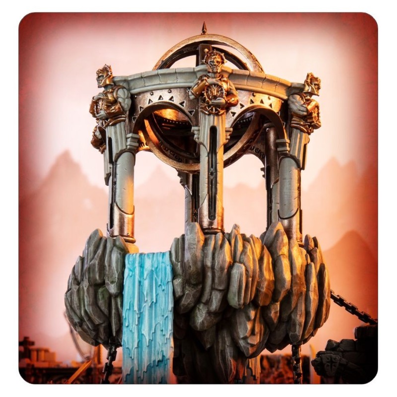 Description du produitLes Aqualithes Purificateurs sont des machines-temples magiques employées par les Croisades Éophores pour apporter de l'eau pure aux colonies nouvellement fondées. Conçus par les mages de la Collégiale, forgés par les ingénieurs Soudefer et bénis par des prêtres sigmarites, ces métalithes flottants absorbent la magie ambiante pour générer un torrent continu d'eau purifiée. On trouve des Aqualithes Purificateurs dans tous les Royaumes Mortels, dans les colonies grandissantes et dans des avant-postes abandonnés, enchaînés au sol et coiffés de statues sacrées.