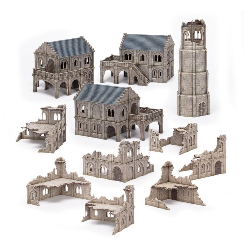 Ce kit en plastique vous permet d'assembler assez de décors modulaires sur le thème du Gondor pour constituer tout un champ de bataille, en combinant une Gondor Tower, trois sets de Gondor Mansions, et six sets de Gondor Ruins Sections. Vous pourrez agencer un champ de bataille saisissant selon une grande variété de configurations, et vous ferez des économies par rapport à l'achat de ces kits au détail.