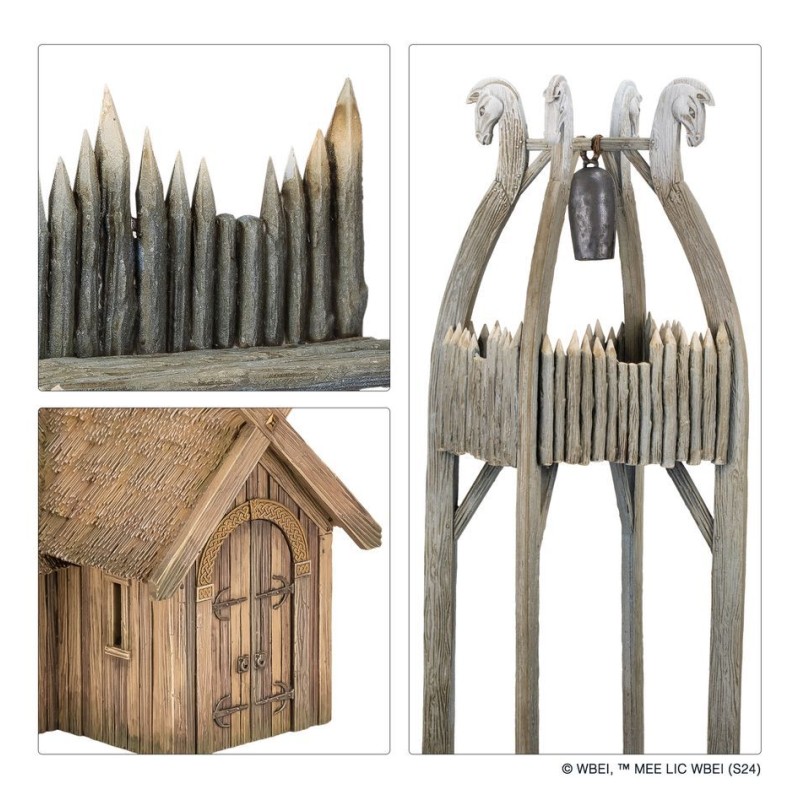 Ce kit en plastique permet d'assembler une place forte du Rohan d'une taille conséquente que vos armées pourront se disputer à Middle-earth Strategy Battle Game. Les six maisons offrent un grand nombre d'options d'assemblage avec leurs murs à double face (chacune ayant des détails différents), et un choix de décorations pour les linteaux du toit. Chacune d'elles peut être assemblée avec une option de porche parmi trois, et le kit inclut aussi tout un ensemble de barrières, de tonneaux et de cordes pour décorer davantage vos maisons. Les deux tours de guet incluent une cloche avec laquelle les défenseurs peuvent sonner l'alarme, et sont fièrement ornées des icônes du Rohan à tête de cheval. Chaque palissade comporte un chemin de ronde de 25mm de large pour accueillir les archers ou les combattants tenant les murs. La porte de la palissade peut être assemblée pour s'ouvrir et se fermer librement, et une poutre amovible peut être placée en travers par les défenseurs afin de barrer l'ouverture. Ce kit inclut aussi huit échelles pour atteindre les palissades, dont quatre peuvent être assemblées de sorte à obtenir une paire d'échelles plus hautes afin que les fantassins atteignent les tours de guet.