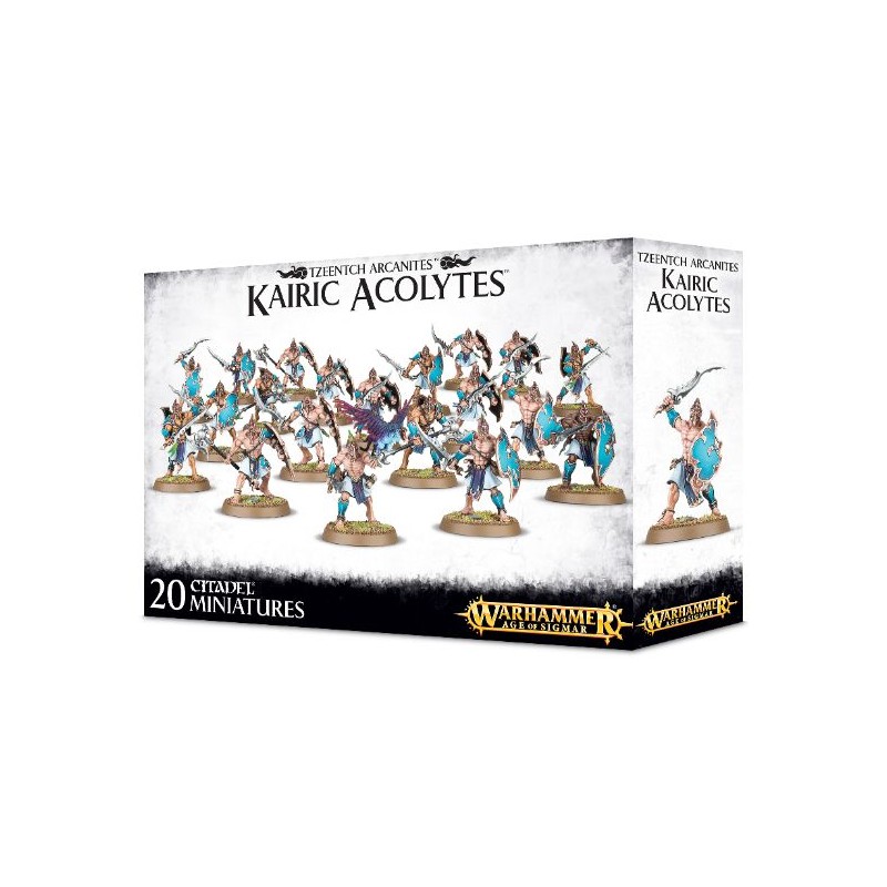 Description du produitCultistes humains de Tzeentch, Choristes du Changement, les Kairic Acolytes ont commis de terribles sacrifices en échange d'une promesse de savoir et de pouvoir, et ils ont passé des décennies à se rendre dignes de tenter l'Épreuve Kairique des Neuf. Ils évoluent à l'insu de leurs concitoyens, en attendant patiemment le moment opportun pour frapper. C'est alors qu'ils exercent collectivement leur puissance magique sous forme d'éclairs ardents, en achevant les rescapés avec leurs sinistres lames incurvées.