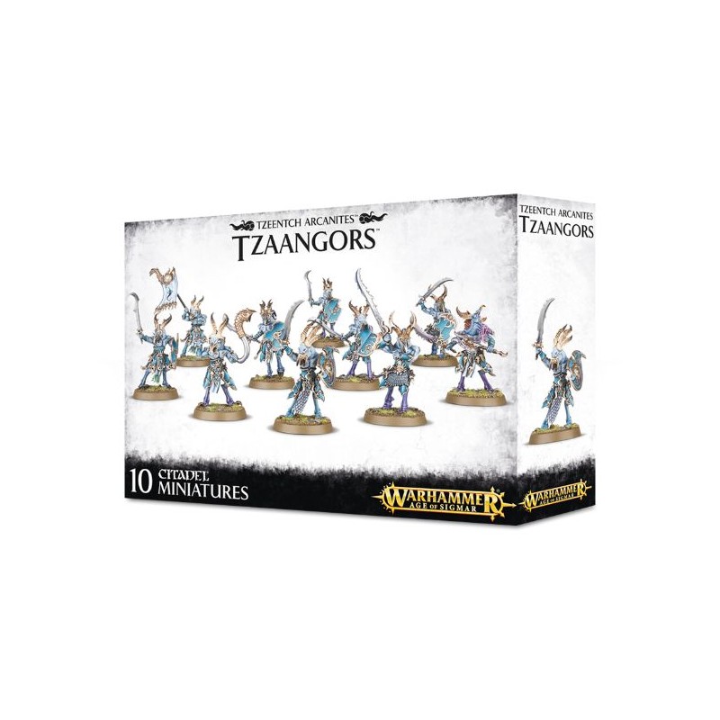 Ce kit plastique permet d'assembler 10 Tzaangors, des mutants à tête d'oiseau voués à Tzeentch. Chaque figurine peut être armée d'un bouclier d'arcanite et d'une lame sauvage, ou d'une paire de lames sauvages en forme de hache. Vous trouverez également les éléments nécessaires pour assembler un champion Madré, un musicien soufflant dans une braillecorne et un porte-icône, ainsi que deux Mutants Tzaangors particulièrement mutés, et deux Tzaangors équipés de grandes lames sauvages.