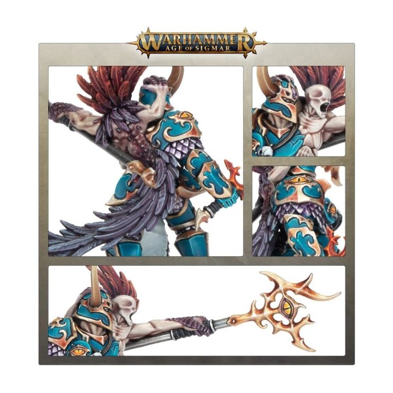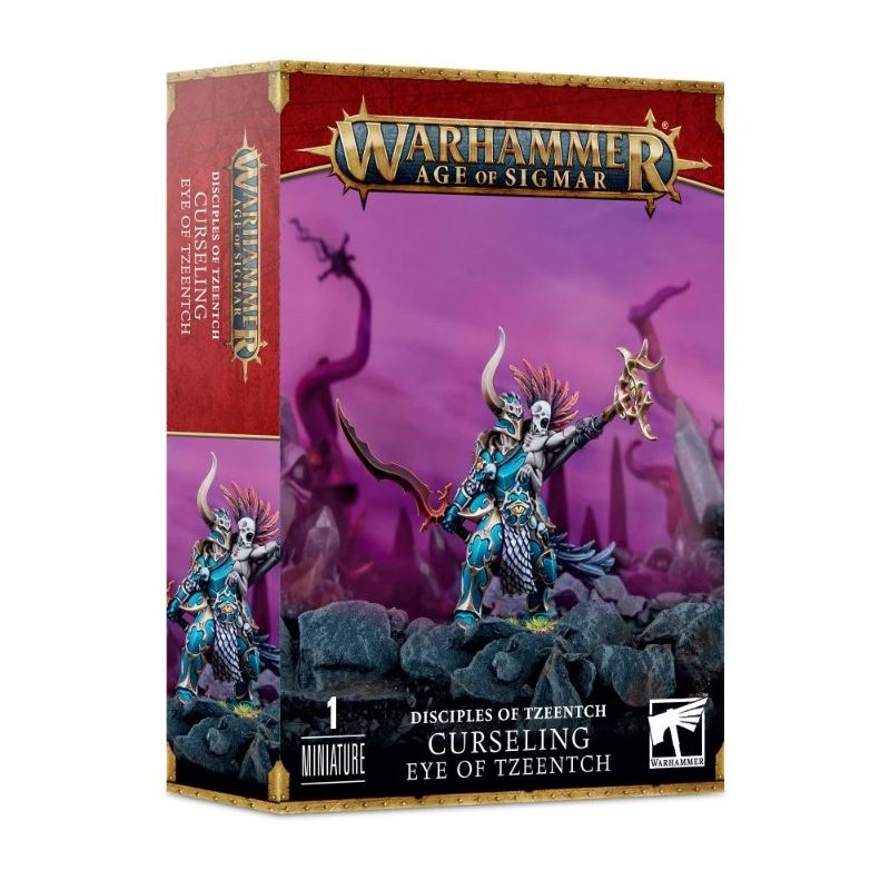 Ce kit plastique permet d'assembler un Imprécateur, Œil de Tzeentch, un puissant guerrier fusionné à une entité démoniaque. Ce Perfidion sans yeux surgit de la chair exposée de l'Imprécateur avec une crinière et une queue de plumes extravagantes, ses bras difformes tenant un bâton magique et saisissant la tête de son hôte comme pour diriger son regard. L'armure ornementée de l'Imprécateur témoigne de ses talents martiaux et est décorée d'écailles délicates et de symboles d'yeux de Tzeentch. Le guerrier manie une épée courbée incandescente dans sa main restante.