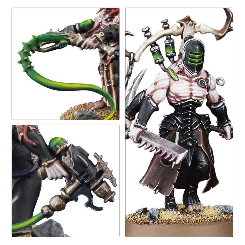 Description du produitLes Gorgones sont insensibles à la douleur – leur peau noueuse n'est guère qu'un amas de tissus scarifiés, tannés comme du cuir. Ces disciples du modelage de chair servent les maîtres ratatinés des coteries, et ont à la fois le statut de cobayes, tout en tendons et en sutures, et d'apprentis de l'art abominable des Hémoncules. Ils reçoivent divers outils cruels, telles des lames de boucher et des bioarmes ésotériques, avec lesquels infliger le maximum de souffrance.