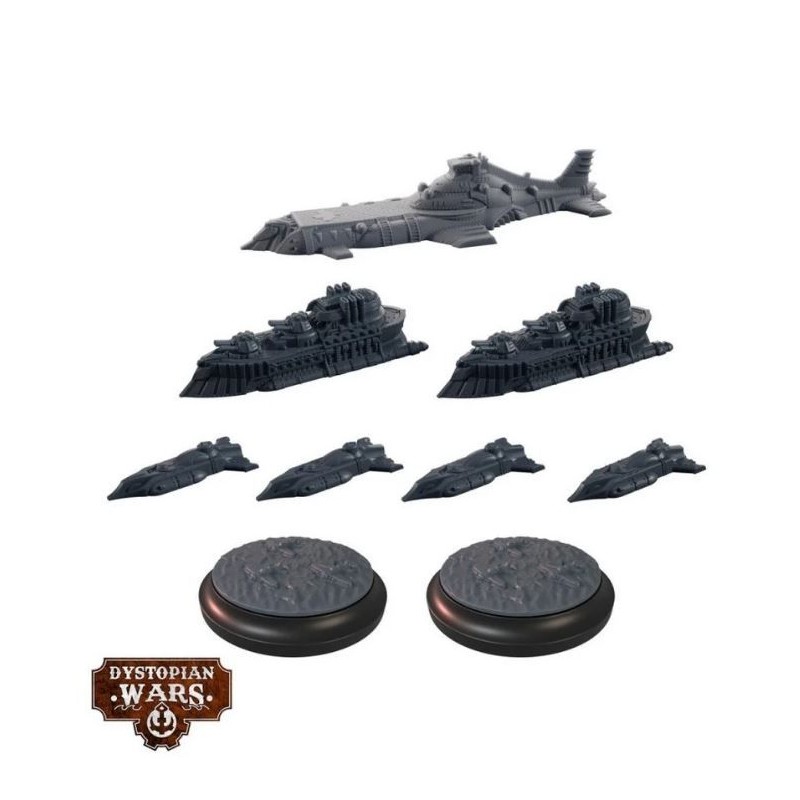 La boîte "Mexico Battlefleet Set" contient une flotte en plastique et résine à l'échelle 1/1200 pour Dystopian Wars. Figurines vendues non assemblées et non peintes.