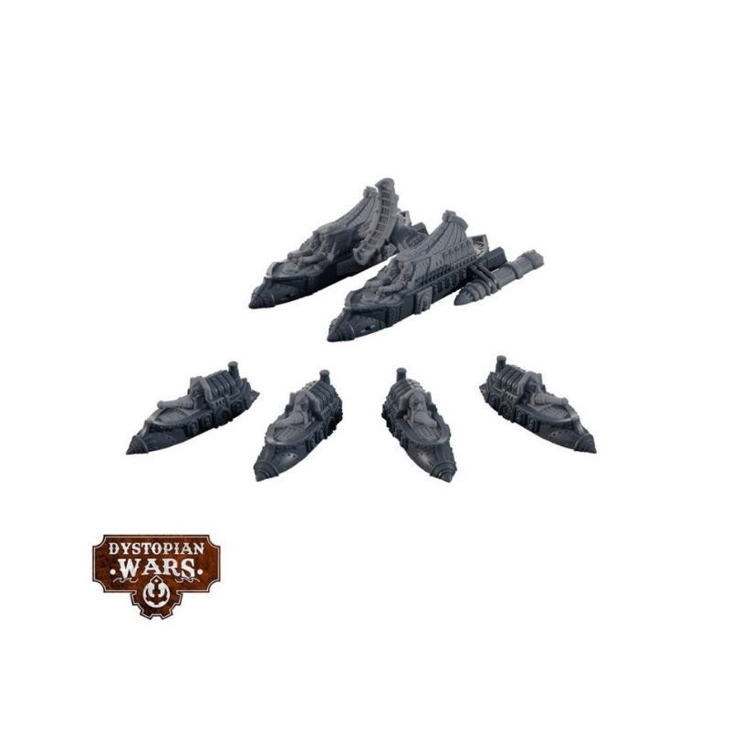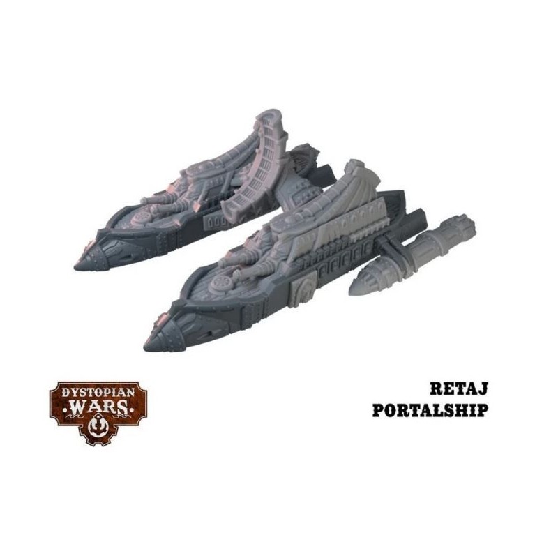 La boîte "Retaj Battlefleet Set" contient une flotte en résine et plastique pour Dystopian Wars. Figurines vendues non assemblées et non peintes.
