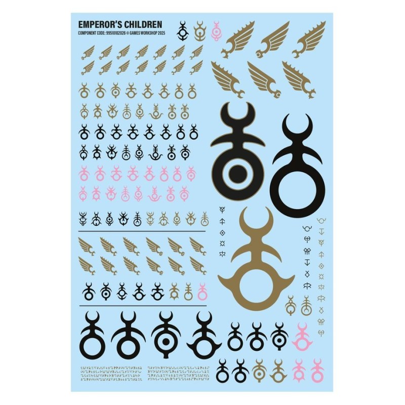 Ce kit est fourni avec 4x Planches de Décalcos des Emperor's Children, proposant chacune 150 décalcos de grande qualité pour décorer vos figurines. Cela inclut des symboles des Emperor's Children de tailles et couleurs diverses, ainsi qu'une sélection de runes et textes de Slaanesh.
