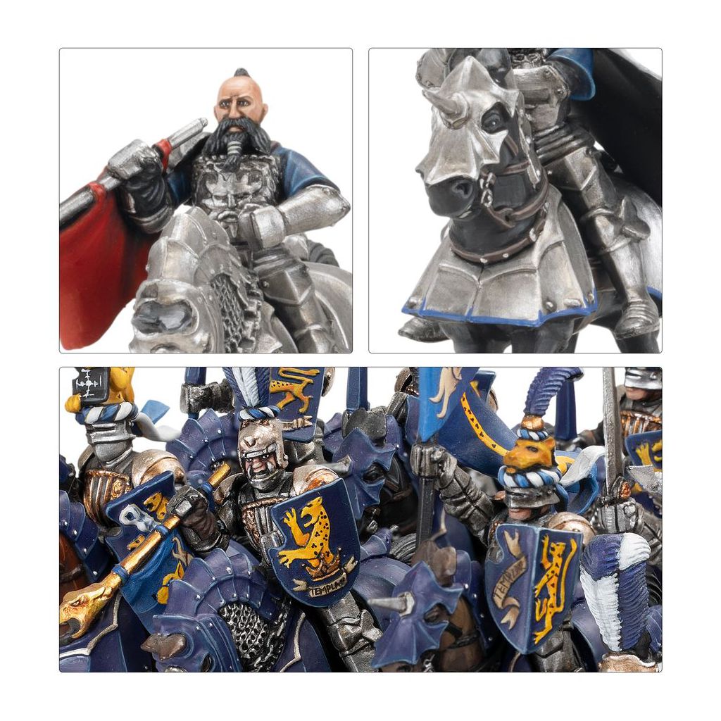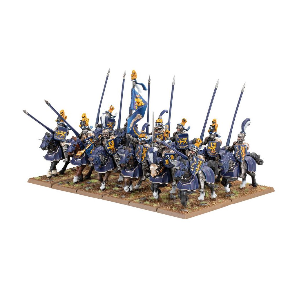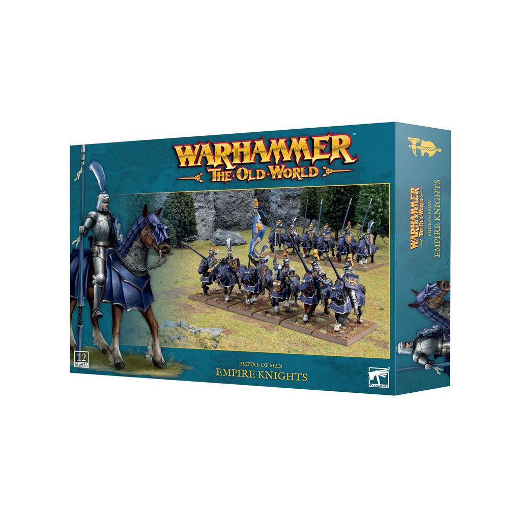 Ce kit en plastique permet d'assembler 12 Chevaliers de l'Empire, pour les utiliser dans votre armée de l'Empire de l'Homme à Warhammer: The Old World. Chaque Chevalier monté peut être doté d'une arme de base ou d'une lance de joute. Deux d'entre eux peuvent être assemblés comme des champions, deux autres comme des porte-étendards, et deux autres comme des musiciens, ce qui signifie que vous pouvez les séparer en deux unités de 6, avec chacune son propre état-major optionnel, ou les aligner comme une seule grosse unité de 12. Vous trouverez aussi des options de têtes et, selon la façon dont vous assemblerez et peindrez vos figurines, elles pourront représenter différents Ordres de Chevalerie de l'Empire, tels les Chevaliers Panthères et les Chevaliers du Loup Blanc.
