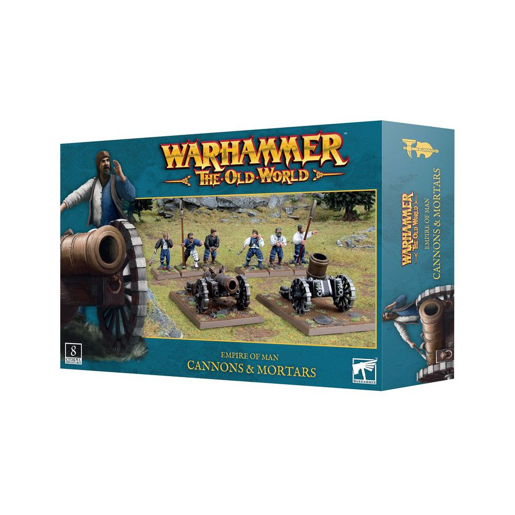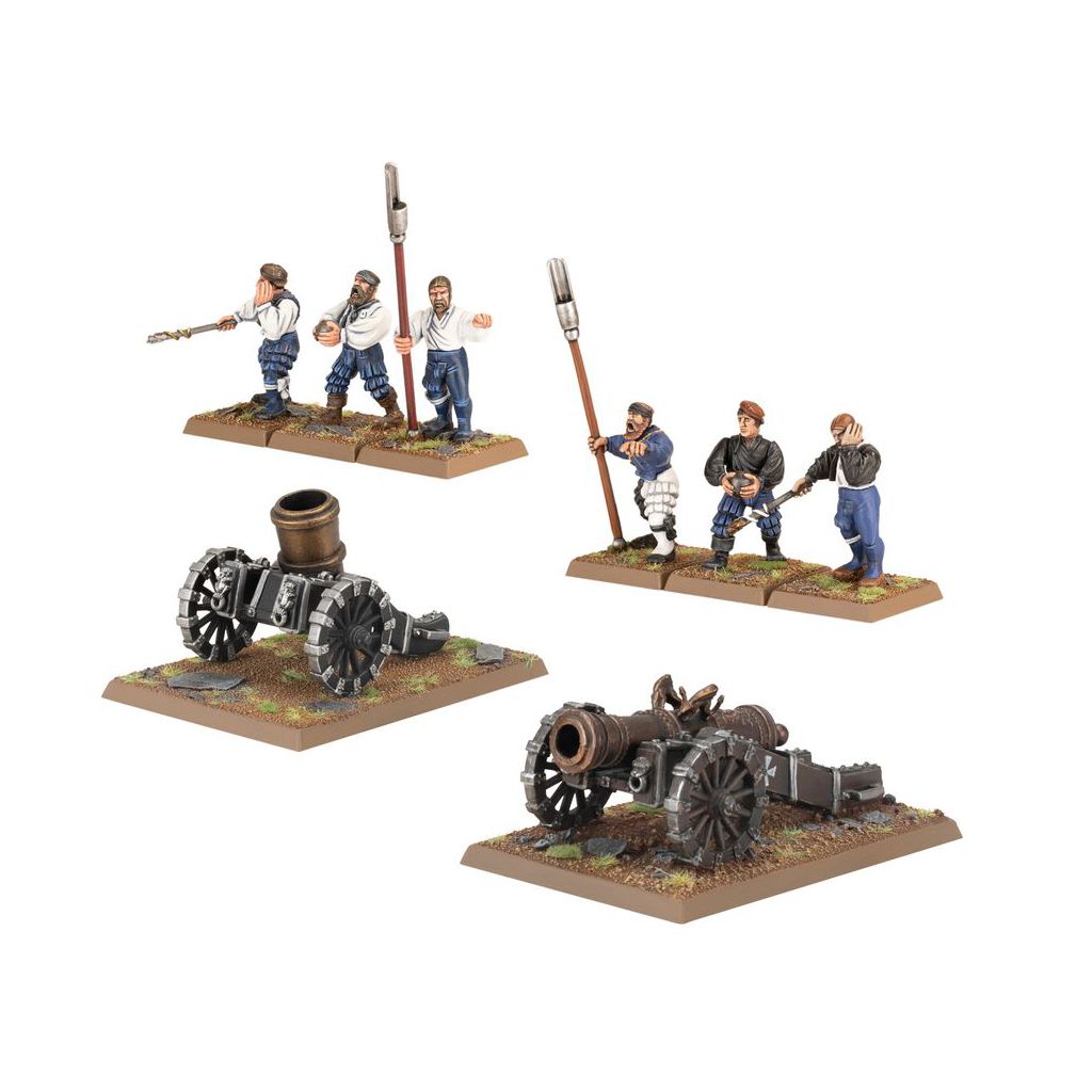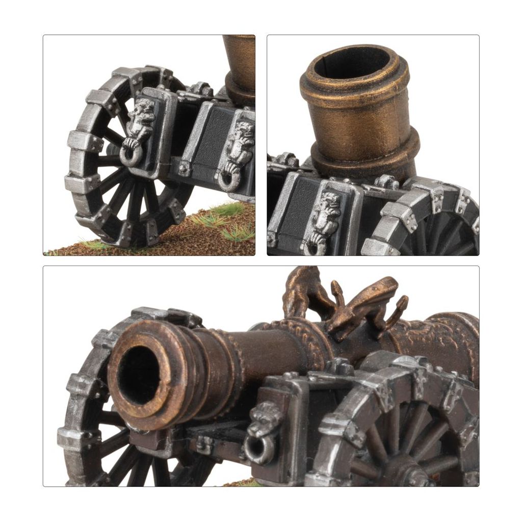 Ce kit en plastique permet d'assembler deux puissantes pièces d'artillerie pour vos armées de l'Empire de l'Homme à Warhammer: The Old World. Chacune peut être assemblée comme un Grand Canon ou un Mortier, accompagné chacun de trois servants dont les bras et les têtes sont interchangeables, rendant facile de les personnaliser. Vous trouverez aussi d'autres accessoires cosmétiques, comme des tonneaux, des seaux et des boulets à placer autour de vos pièces d'artillerie.