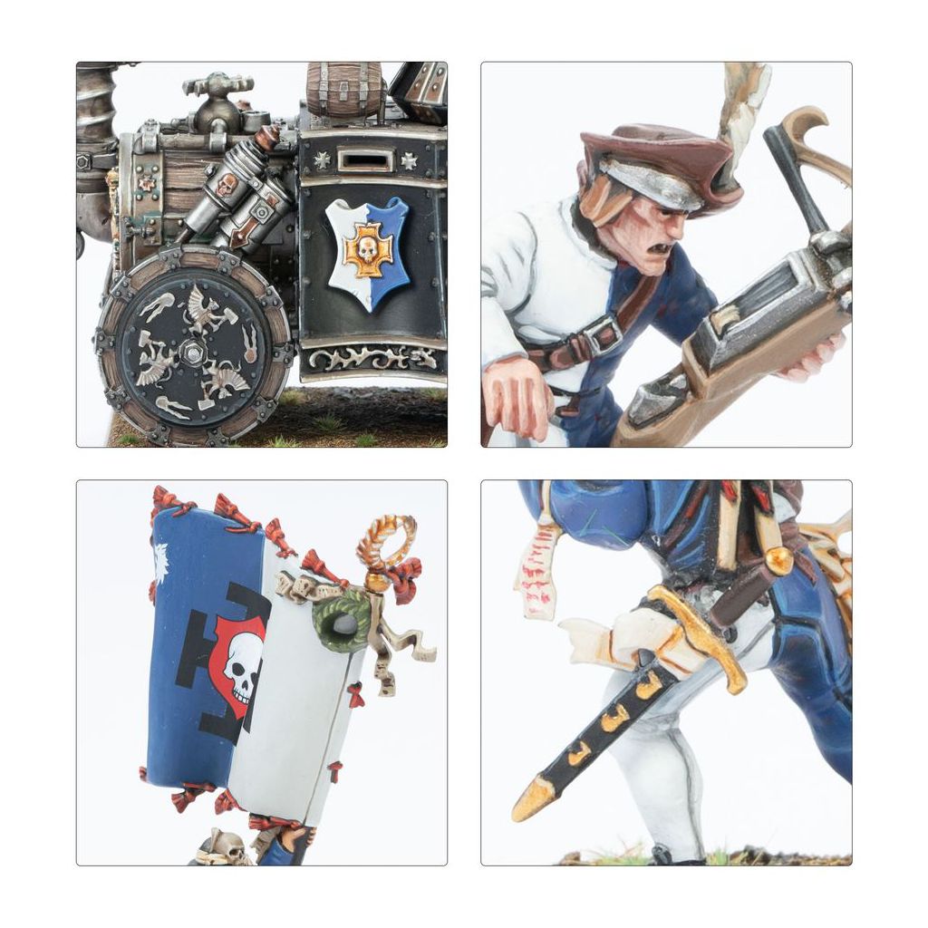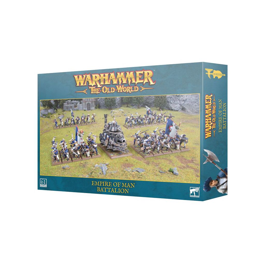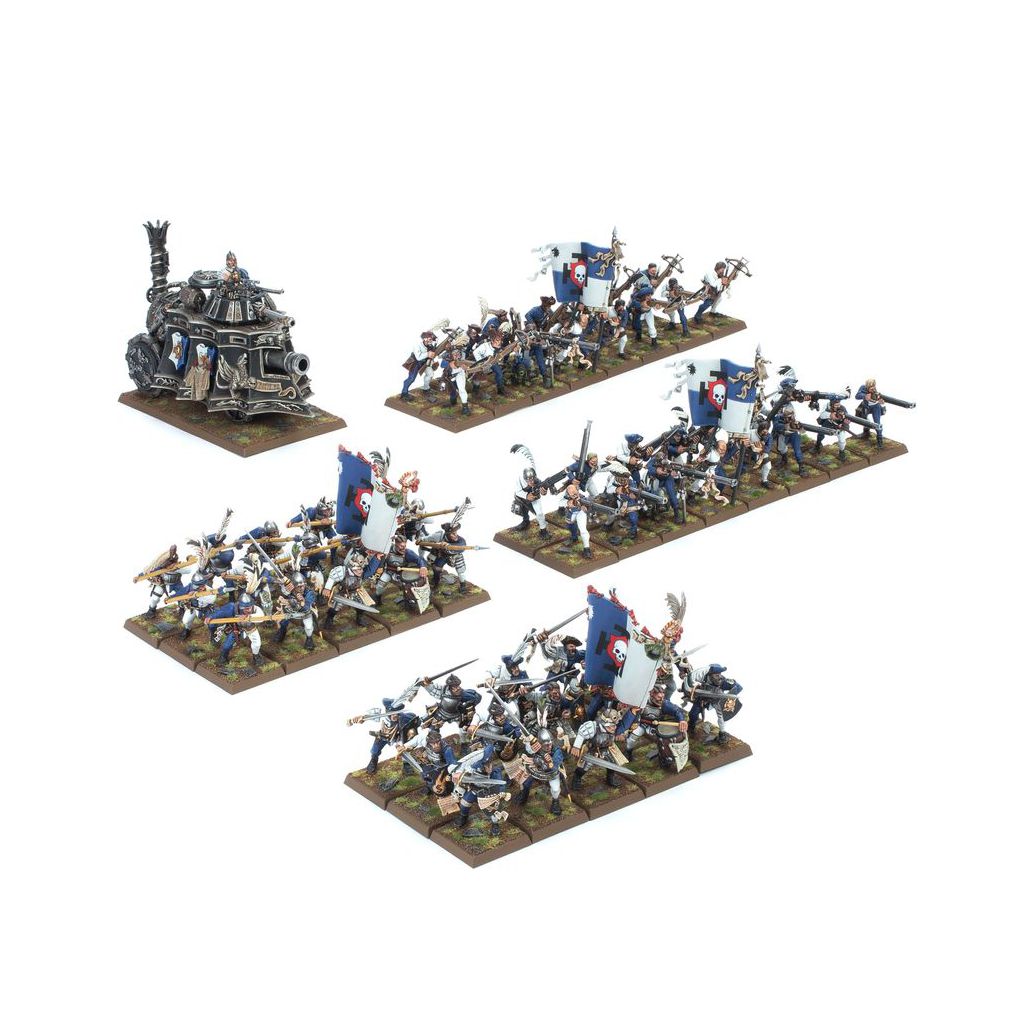 Cette boîte vous fournit le noyau d'une puissante armée de l'Empire de l'Homme pour Warhammer: The Old World. C'est un bon moyen d'entamer une nouvelle force ou d'en étoffer une existante. Les Troupes Régulières de cette boîte peuvent être équipées de diverses options d'armes incluant des hallebardes et des lances, et peuvent aussi faire office de Vétérans des Troupes Régulières. Les Troupes de Tir de l'Empire peuvent être assemblées comme une seule unité de 30, armée d'arquebuses ou d'arbalètes, ou de 15 de chaque. Le kit inclut aussi les éléments supplémentaires pour distinguer des membres de ces unités comme des champions, des porte-étendards et des musiciens. Ces braves soldats polyvalents sont rejoints au combat par un Tank à Vapeur, disposant de multiples options cosmétiques afin que vous puissiez personnaliser votre machine de guerre redoutable.