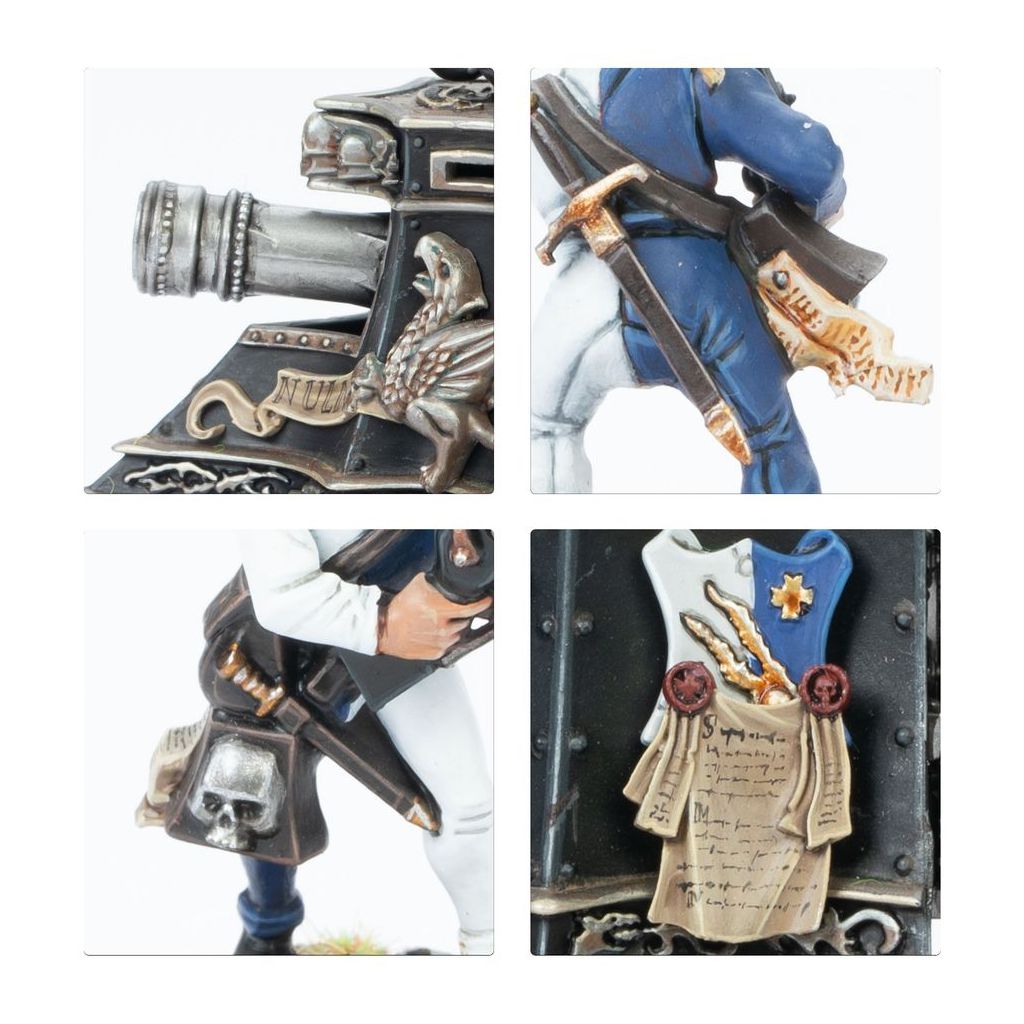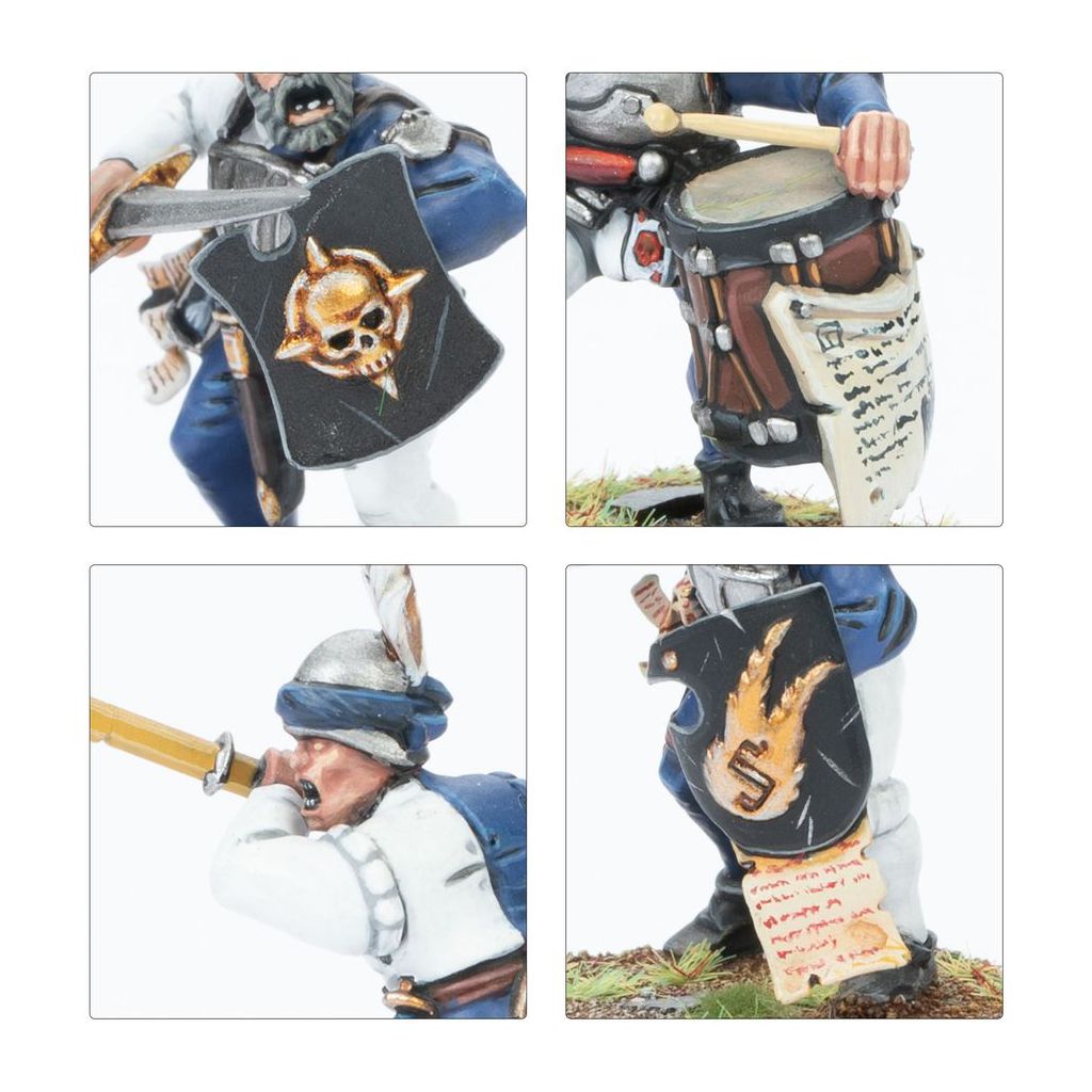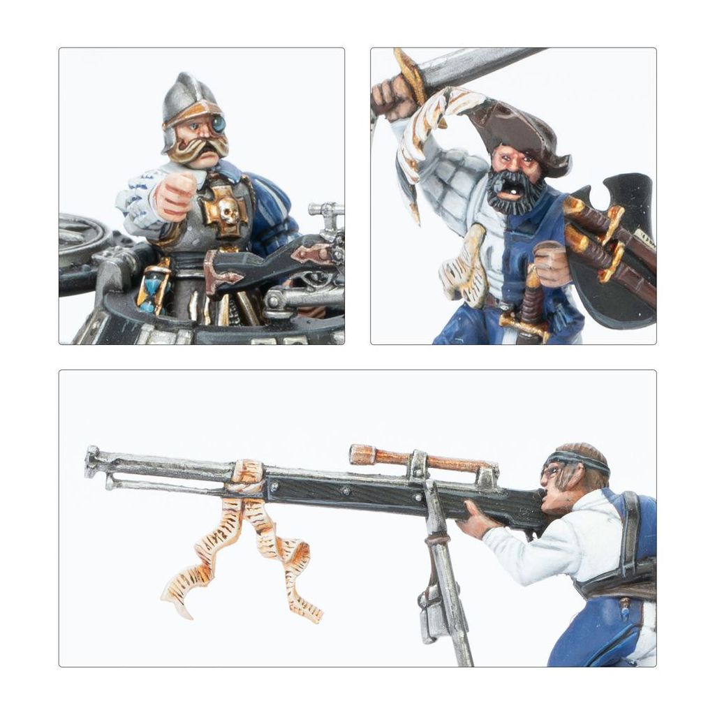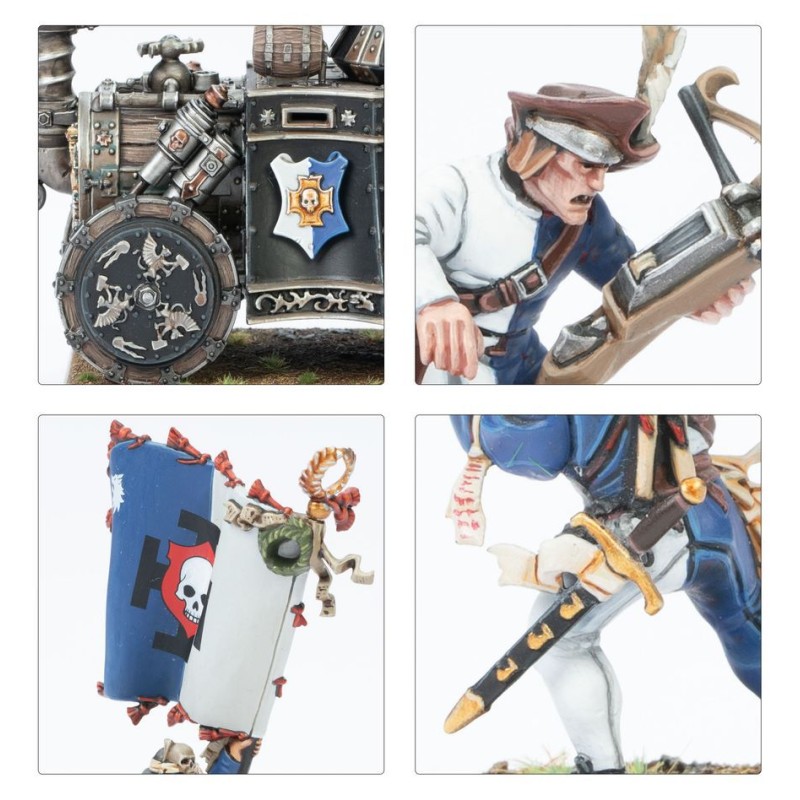 Cette boîte vous fournit le noyau d'une puissante armée de l'Empire de l'Homme pour Warhammer: The Old World. C'est un bon moyen d'entamer une nouvelle force ou d'en étoffer une existante. Les Troupes Régulières de cette boîte peuvent être équipées de diverses options d'armes incluant des hallebardes et des lances, et peuvent aussi faire office de Vétérans des Troupes Régulières. Les Troupes de Tir de l'Empire peuvent être assemblées comme une seule unité de 30, armée d'arquebuses ou d'arbalètes, ou de 15 de chaque. Le kit inclut aussi les éléments supplémentaires pour distinguer des membres de ces unités comme des champions, des porte-étendards et des musiciens. Ces braves soldats polyvalents sont rejoints au combat par un Tank à Vapeur, disposant de multiples options cosmétiques afin que vous puissiez personnaliser votre machine de guerre redoutable.