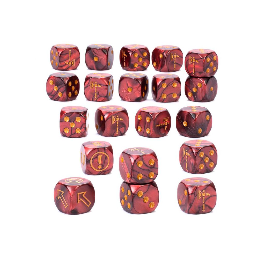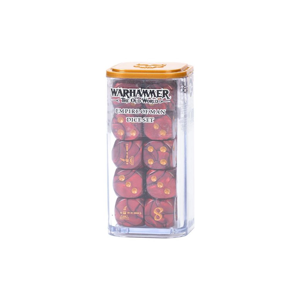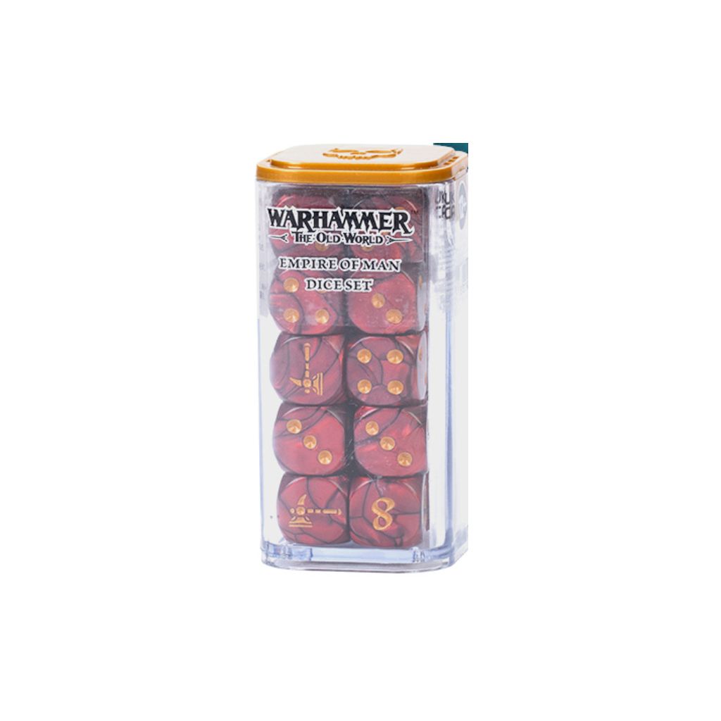 Ce set inclut 20 dés sur le thème de l'Empire de l'Homme. Ils sont moulés en plastique rouge nacré avec des marquages dorés. Les dés à six faces arborent fièrement une icône stylisée du Marteau de Guerre de Sigmar sur la face du 6.