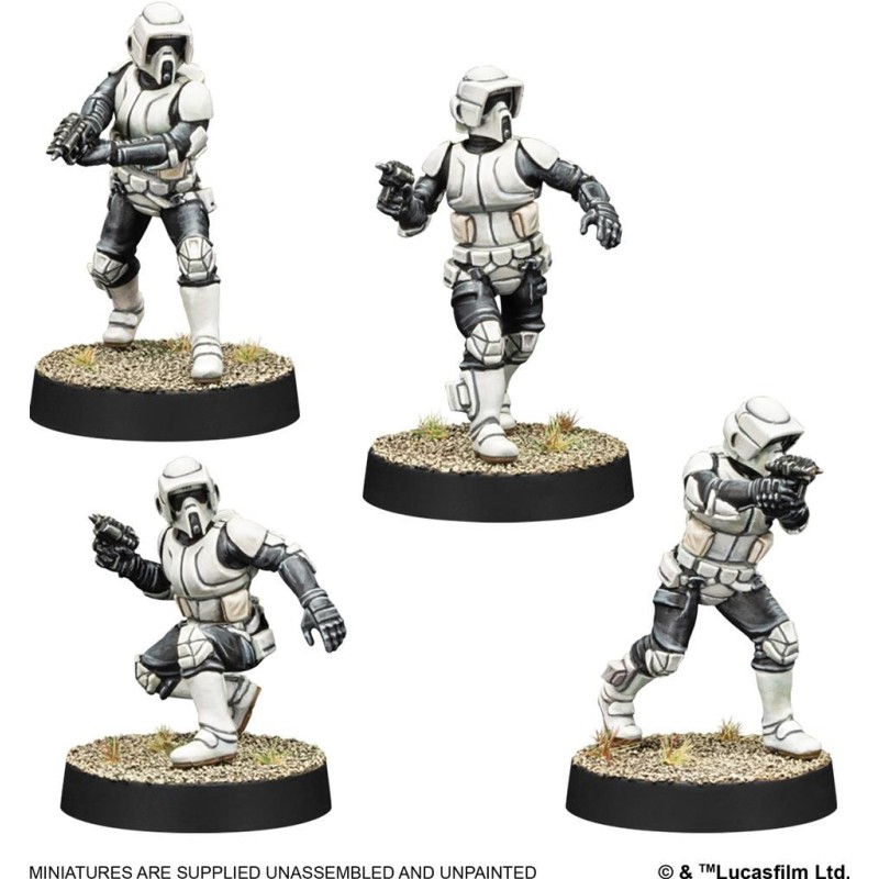 L’extension d’unité Scout Troopers contient 7 figurines, dont 1 Chef Scout Trooper, 4 Scout Troopers et 2 Scout Troopers avec des armes lourdes, qui vous permettront de constituer une unité de Scout Troopers et une unité de Groupe de Combat Scout Troopers.
