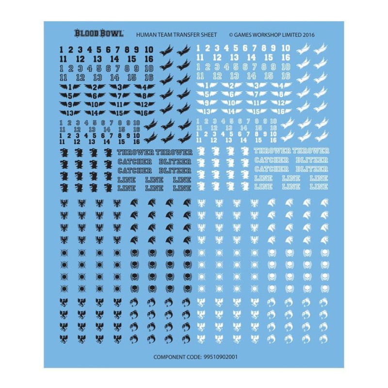 ainsi que 6 ballons, une pièce double face pour le score et une planche de décalcomanies. Fourni avec 12 socles ronds de 32mm pour Blood Bowl, avec un trou prévu pour y fixer le ballon quand la figurine le détient.