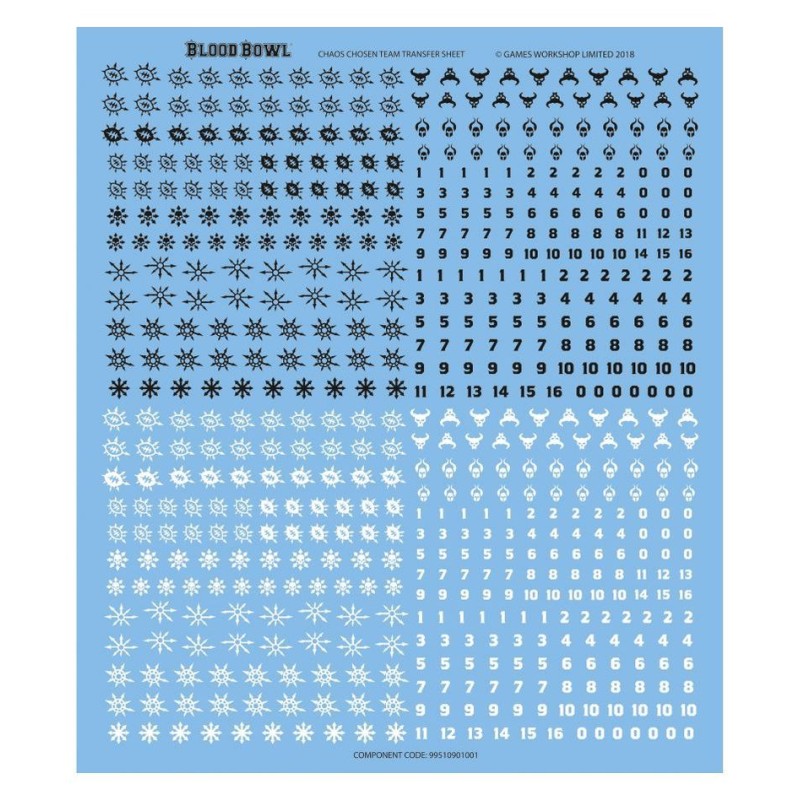 Le kit offre également de nombreux bonus – 2 pions de tour, 2 jetons de score en forme d'étoile du Chaos et 6 ballons, 2 de chaque modèle: ballon enflammé, crâne, et crâne sans tenon. Le tout est fourni avec 12 socles de 32mm pour Blood Bowl, une feuille d'équipe à 1 000 000 PO et une planche de décalcomanies du Chaos.