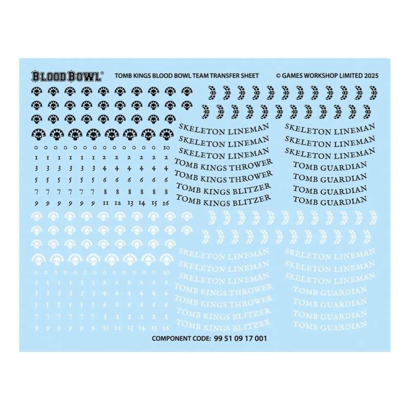 Ce kit est fourni avec une Planche de Décalcos d'Équipe de Rois des Tombes pour Blood Bowl, proposant 298 décalcos de grande qualité, dont des icônes des Rois des Tombes, des éléments décoratifs, des identificateurs de poste et des numéros pour décorer vos figurines.