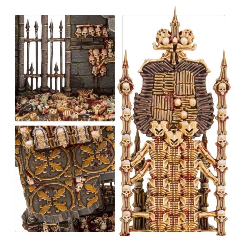 Description du produitFormé à partir des ossements des victimes de la magie d'un Abhorrant, un Charnel Throne exsude la folie et les énergies nécrotiques. Ce sont les sièges de pouvoir des Archregents et des Ghoul Kings, des fanals glorieux aux yeux des mordants, et des structures abjectes pour les ennemis des Flesh-eater Courts.