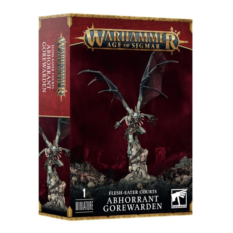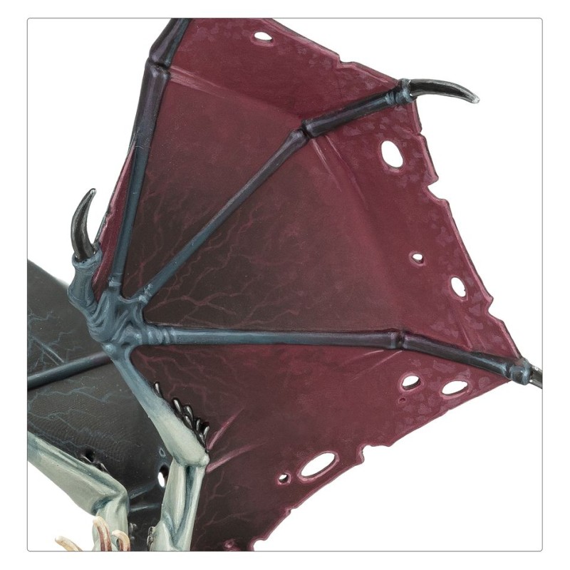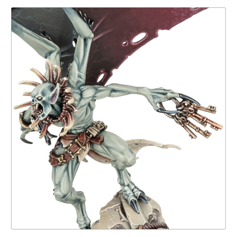 Ce kit plastique permet d'assembler une Sangtinelle Abhorrante, un margrave des Cours de Mangechairs. Cette gargouille terrifiante se laisse porter par les vents de Shyish sur ses ailes de cuir, et bondit de son perchoir pour survoler le champ de bataille et trouver sa proie. Sa silhouette monstrueuse est ornée d'une sinistre parodie des atours de la noblesse, et elle tient dans ses griffes acérées un trousseau de clés, symbole de son devoir royal.