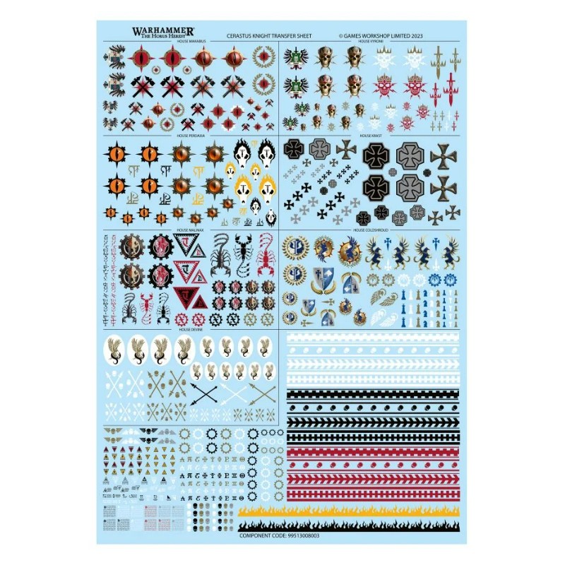 Ce kit est composé de 247 éléments en plastique et est fourni avec un socle ovale Citadel de 170x109mm. Il contient également une Planche de Décalcomanies de Chevalier Cerastus de l'Âge des Ténèbres proposant 517 marquages et icônes optionnels pour les Maisonnées Chevaleresques de l'Hérésie d'Horus. Cette figurine est fournie non peinte et nécessite assemblage