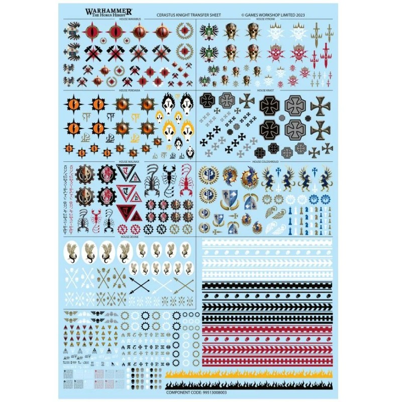 Ce kit est composé de 253 éléments en plastique et est fourni avec un socle ovale Citadel de 170x109mm. Il contient également une Planche de Décalcomanies de Chevalier Cerastus de l'Âge des Ténèbres proposant 517 marquages et icônes optionnels pour les Maisonnées Chevaleresques de l'Hérésie d'Horus. Cette figurine est fournie non peinte et nécessite assemblage