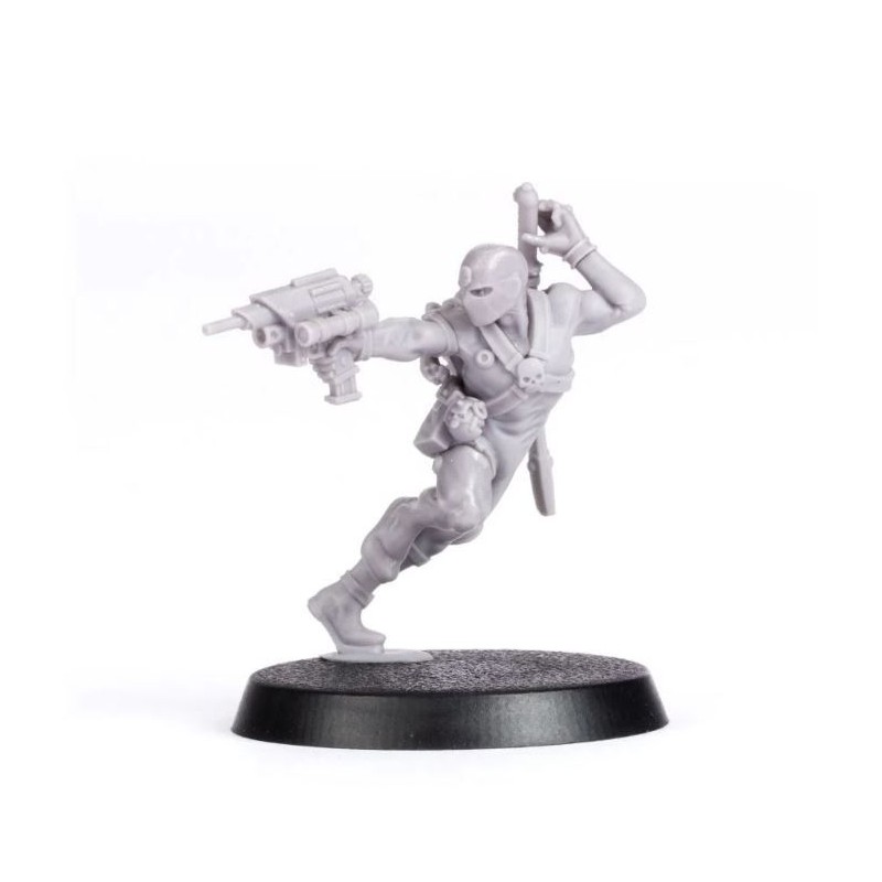 Ce kit en résine en plusieurs parties permet de construire un Assassin de la Clade Adamus, un agent de l'Assassinorum au service du Régent impérial. Vêtu d'une combinaison élégante avec un masque complet sinistre, cet artiste martial suprême est posé dans une fente dynamique, se précipitant en arrière tout en tirant des boulons explosifs et des fléchettes envenimées de son blaster à aiguilles. Son autre main est prête à dégainer la lame nemesii rengainée sur son dos, pour trancher la tête d'un commandant ennemi d'un coup fatal parfait.