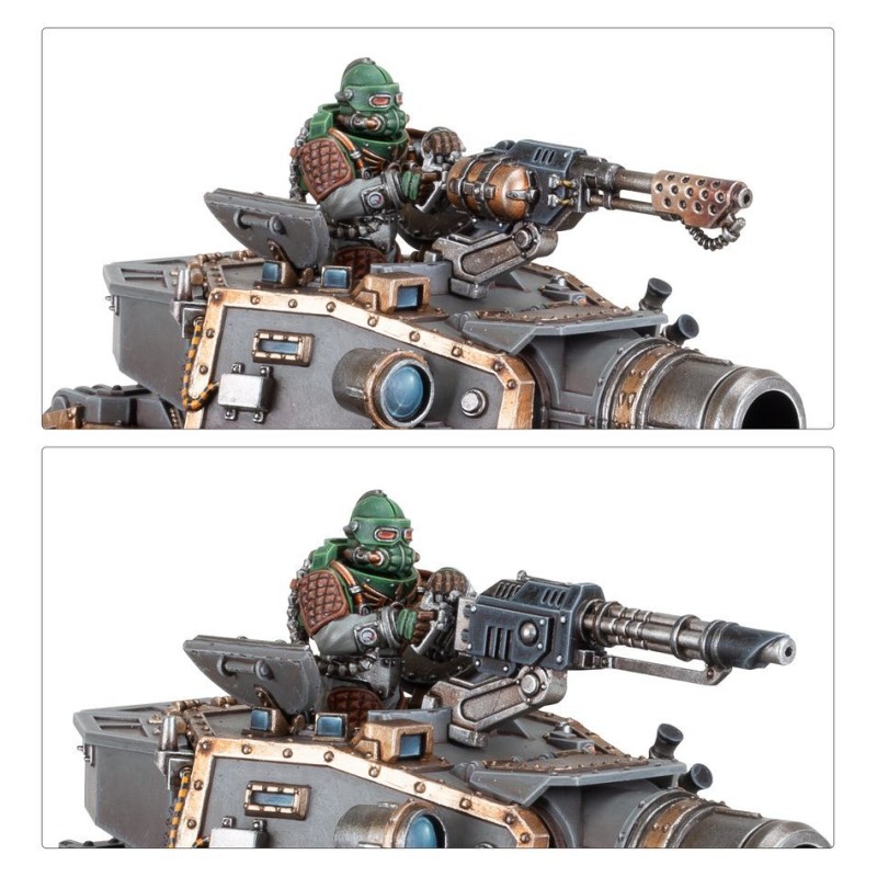 Ce kit contient les éléments nécessaires pour améliorer votre Leman Russ avec un missile traqueur et une lame de bulldozer, et l'écoutille de tourelle peut être assemblée avec ses portes fermées, ou ouvertes pour accueillir un artilleur des Solar Auxilia avec une arme sur pivot: un lance-flammes lourd, un multi-laser ou une mitrailleuse. Vous trouverez également de nombreux élémenst esthétiques, comme des symboles, des plaques de blindage, un observateur et un choix de têtes d'équipage.
