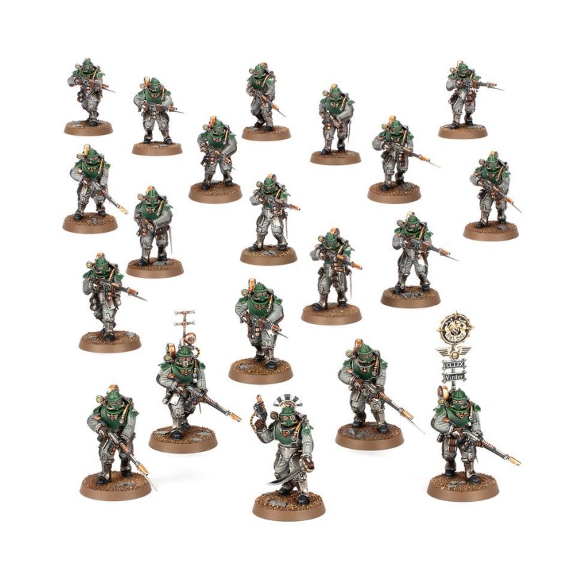 Description du produitLes Sections de Fusiliers constituent le noyau des Solar Auxilia: des soldats entraînés pour livrer bataille sur tous les champs de bataille de la galaxie. Engoncés dans leurs scaphandres emblématiques, ces fantassins peuvent combattre dans des killzones toxiques, sur des mondes hostiles extraterrestres, et même dans le vide glacial de l'espace. Qu'elles soient organisées en rangs disciplinés pour tenir face à une horde de xénos ou qu'ils lancent un assaut généralisé sur les positions ennemies,les Sectiosn de Fusiliers peuvent lâcher volée après volée de tirs de laser concentrés jusqu'à remporter la bataille.
