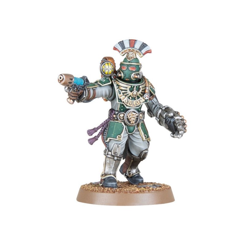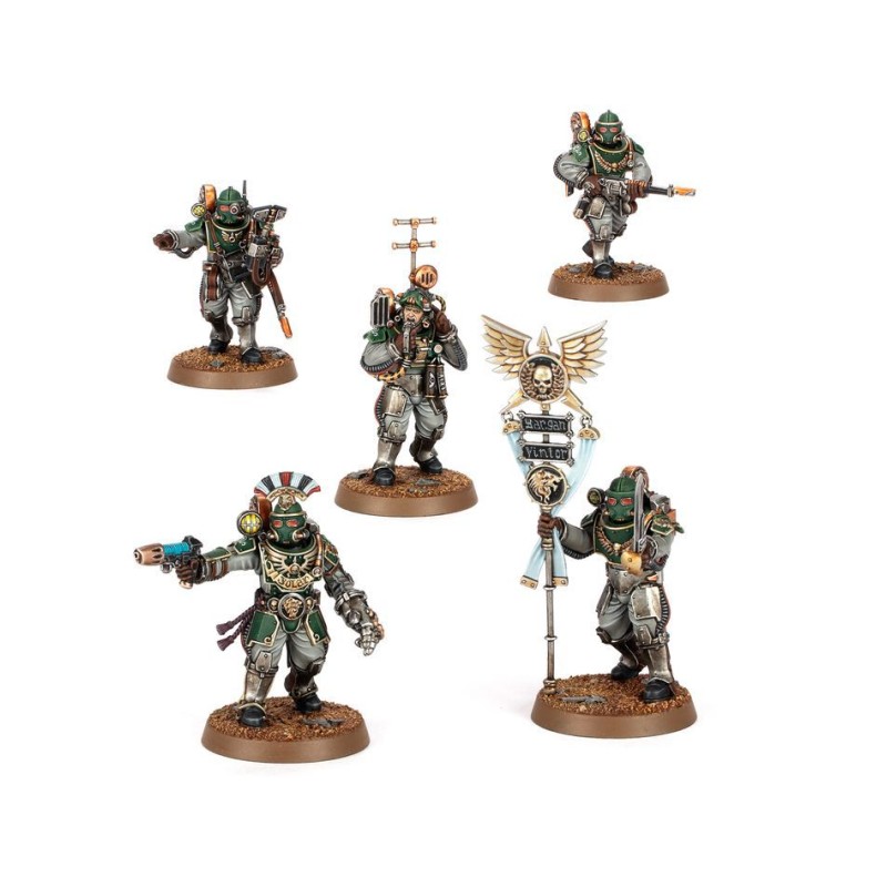Description du produitLes Sections d'État-major des Solar Auxilia sont des spécialistes du commandement et du contrôle sur le terrain. Menées par un Capitaine ou un sous-officier équivalent, ces sections d'experts facilient la transmission des ordres, dirigent les tercios et coordonnent les opérations d'artillerie et orbitales. Ces rôles cruciaux sont répétés par les Sections d'État-major de Ligne plus novices qui mènenet les troupes de première ligne, tandis que les officiers plus influents et plus décorés des Solar Auxilia, généralement appelés Maréchaux Légats, se rendent au combat avec des gardes personnels et à qui ils ouvrent leurs armureries privées.