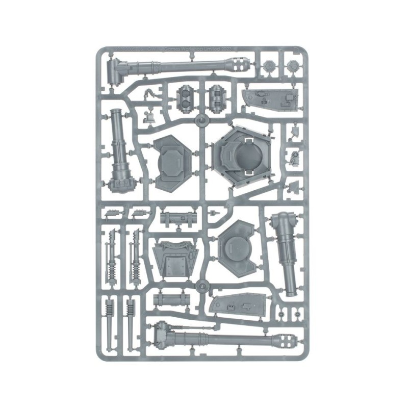 Le Char de Frappe Leman Russ peut être armé d'une des quatre armes de tourelles suivantes: un obusier, un canon laser jumelé, un autocanon Gravis ou un canon Vanquisher avec mitrailleuse coaxiale. Vous pouvez également choisir une arme de coque parmi cinq différentes: un bolter lourd, un canon laser, un autocanon, un multi-laser ou un lance-flammes lourd. Vous trouverez en option un missile traqueur, des projecteurs et une lame de bulldozer, ainsi qu'un lance-flammes lourd, un multi-laser ou une mitrailleuse sur pivot. Le kit propose également un cognis-signum pour faire de votre Leman Russ un Char d'État-major, avec dans ce cas la possibilité de lui ajouter un bouclier répulsif.