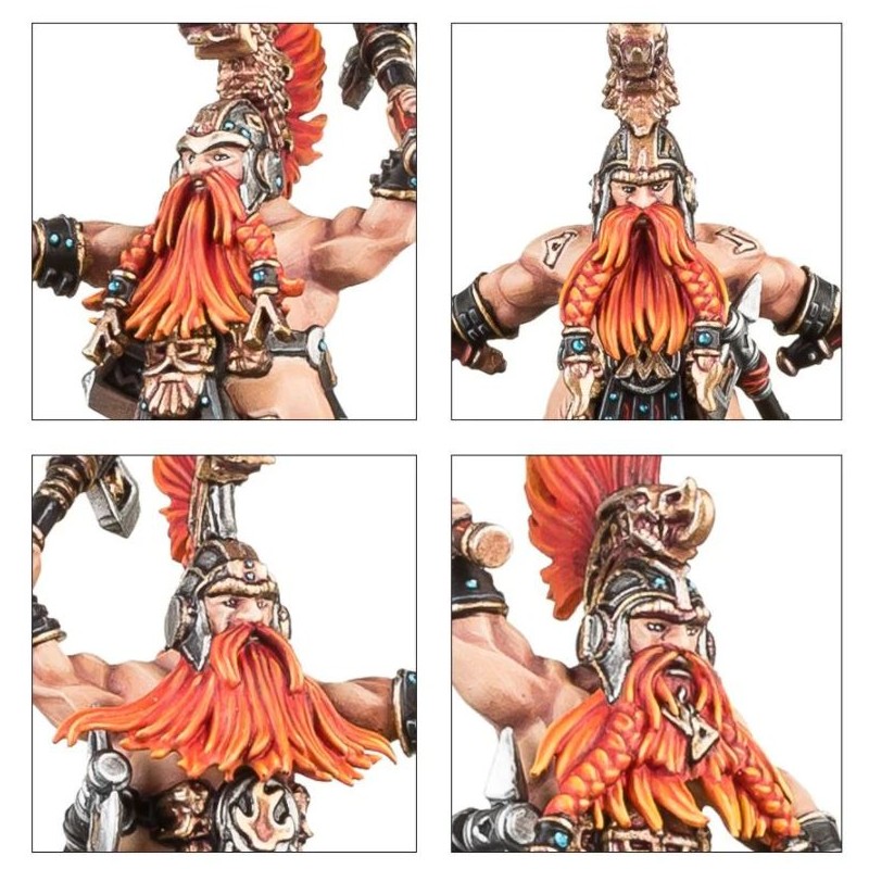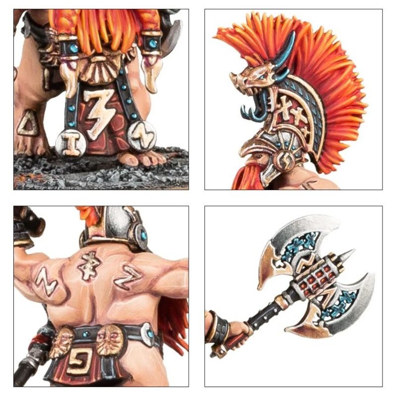 Description du produitFameux dans tous les Royaumes pour leur valeur martiale et leur totale absence de peur même face à des adversaires qui dominent leur silhouette trapue, les Vulkite Berzerkers sont redoutés à juste titre. Ces combattants téméraires doivent leur existence à une antique tradition qui s'accroche obstinément à la fierté guerrière, et ils forment le gros des effectifs de leur loge quand elle part en guerre. Promettant à grands cris une mort violente à l'ennemi, ces guerriers sont à la hauteur de leur réputation, et se déchaînent dans une tornade de haches et de runes d'ur-or. La légende parle de Vulkite Berzerkers faisant fi de blessures mortelles pour tout autre Fyreslayer, et refusant de mourir devant leurs frères. Les porteurs du Cor de Grimnir sont réputés avoir la voix tonnante de Grimnir en personne, et de fait le son du cor ravive l'éclat des runes d'ur-or incrustées dans le corps des Fyreslayers présents sur le champ de bataille, en éveillant l'esprit de leur dieu...