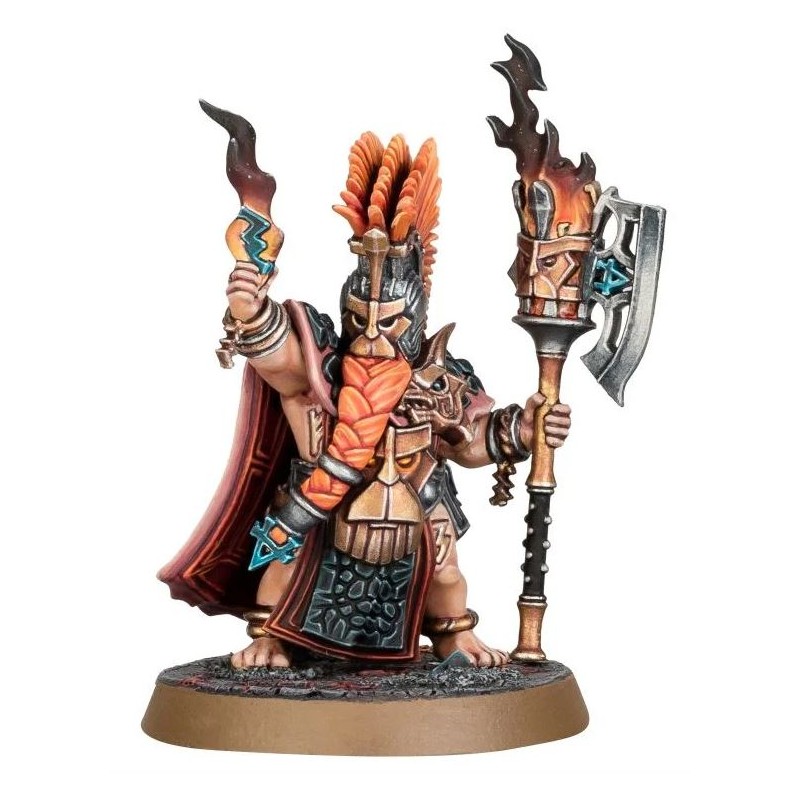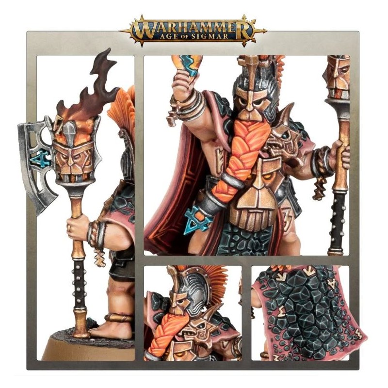 Ce kit plastique permet d'assembler un Gardefeu Aurique, Un Héros et Totem de soutien funéraire pour les armées de Pyrotueurs. Paré d'une cape sacrée en peau de salamandre et d'un austère masque mortuaire, ce duardin brandit la Rune Majeure de Flamme d'une main et tient une hache à brasero enflammée dans l'autre. Au combat, ce prêtre-guerrier se faufile jusqu'au cœur de la mêlée, et puise dans la puissance de l'ur-or récolté sur ses camarades tombés pour activer un effet magique parmi plusieurs.