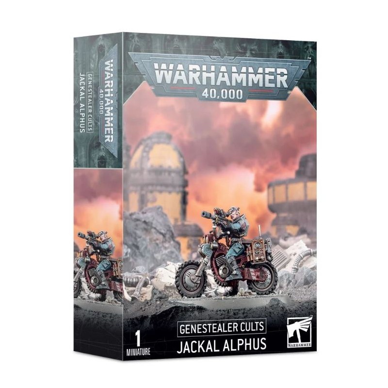 Le Jackal Alphus est un chef tout trouvé pour une armée mécanisée des Genestealer Cults, prêt à prendre la tête de colonnes d'Atalan Jackals ou de Goliath Trucks sur sa moto tout-terrain. Avec son fusil de sniper Jackal, ce personnage peut s'en prendre aux champions ennemis, et son aptitude Cible Prioritaire Repérée vous permet de désigner des unités adverses pour procéder à leur destruction, en rendant le tir des Genestealer Cults plus précis à leur encontre.