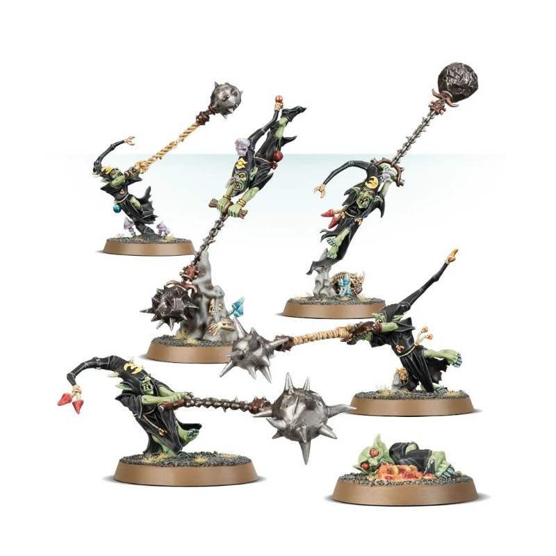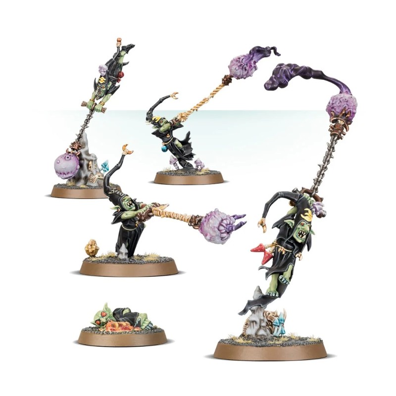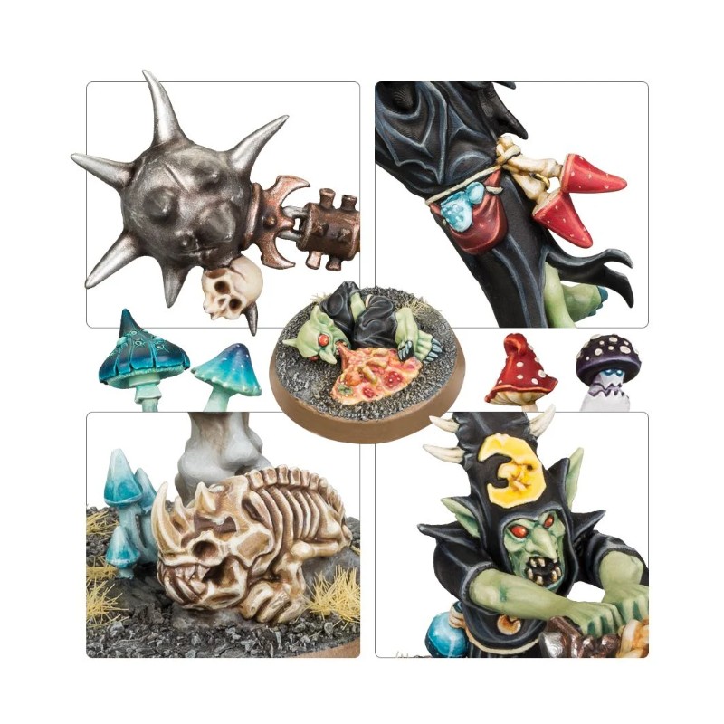 Ce kit permet de monter 5 Loonsmasha Fanatics ou 5 Sporesplatta Fanatics. Il est riche en détails et offre de nombreuses pièces en sus, dont un squelette de squig, des champignons et un Grot malade – de quoi mettre de l'ambiance sur les socles de votre choix.
