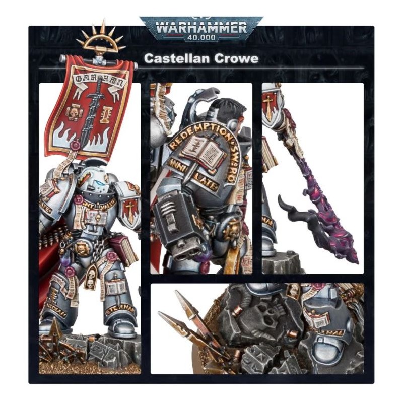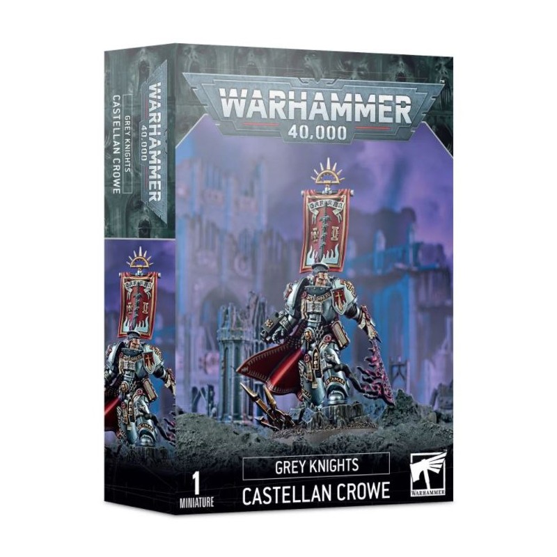 Le Castellan Crowe est un guerrier incorruptible et un puissant choix QG pour une force de Grey Knights. Duelliste hors pair, Crowe peut isoler et abattre les personnages ennemis avec l’Épée Noire maudite d’Antwyr, sa volonté indomptable lui permettant d'encaisser des blessures qui auraient raison d'un autre Space Marine. Psyker habile, Crowe peut également déchaîner des vagues de flammes psychiques sur ses ennemis.