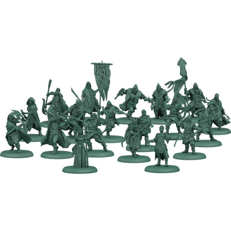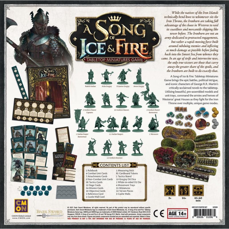 La maison des Fer-nés entre dans la bataille ! Pirates, combattants féroces, ses membres sont réputés sans merci, sauvages et brutaux. Isolés sur leurs îles de Fer, perdues au milieu d’eaux tumultueuses, les vassaux et les seigneurs Greyjoy vénèrent le Dieu Noyé, une divinité bien à eux, et luttent avec le continent pour que leur indépendance soit reconnue. Craints sur toutes les côtes, cette boîte de base vous permet de recruter leurs troupes féroces et leurs héros sans pitié !