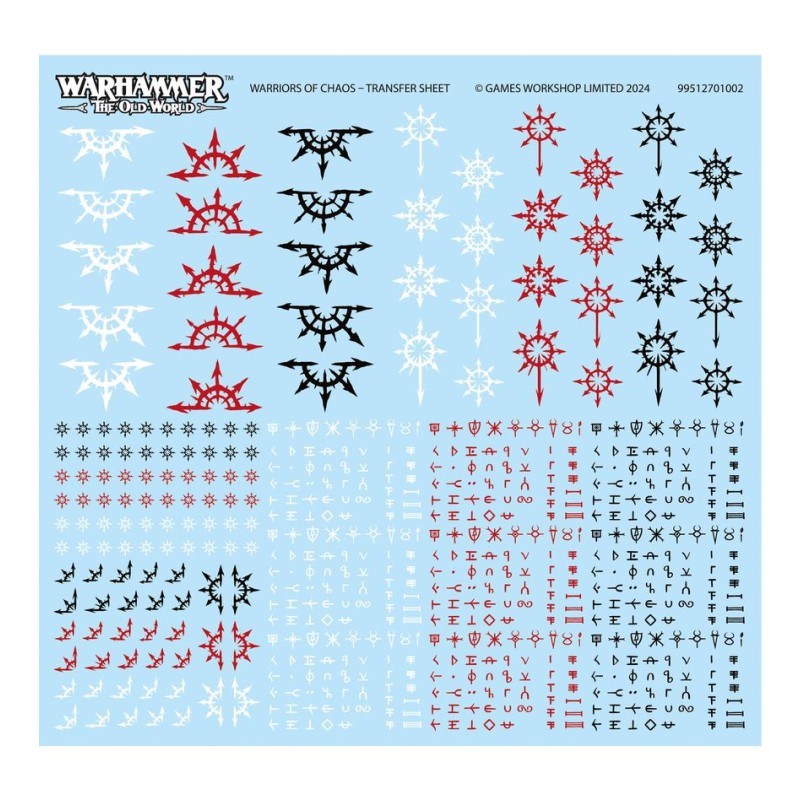 Ce kit est composé de 212 éléments en plastique, et il est fourni avec 10x Socles Rectangulaires Citadel de 30x60mm. Ce set inclut aussi 1x Planche de Décalcos des Guerriers du Chaos proposant 621x Décalcos de haute qualité pour personnaliser davantage vos forces.